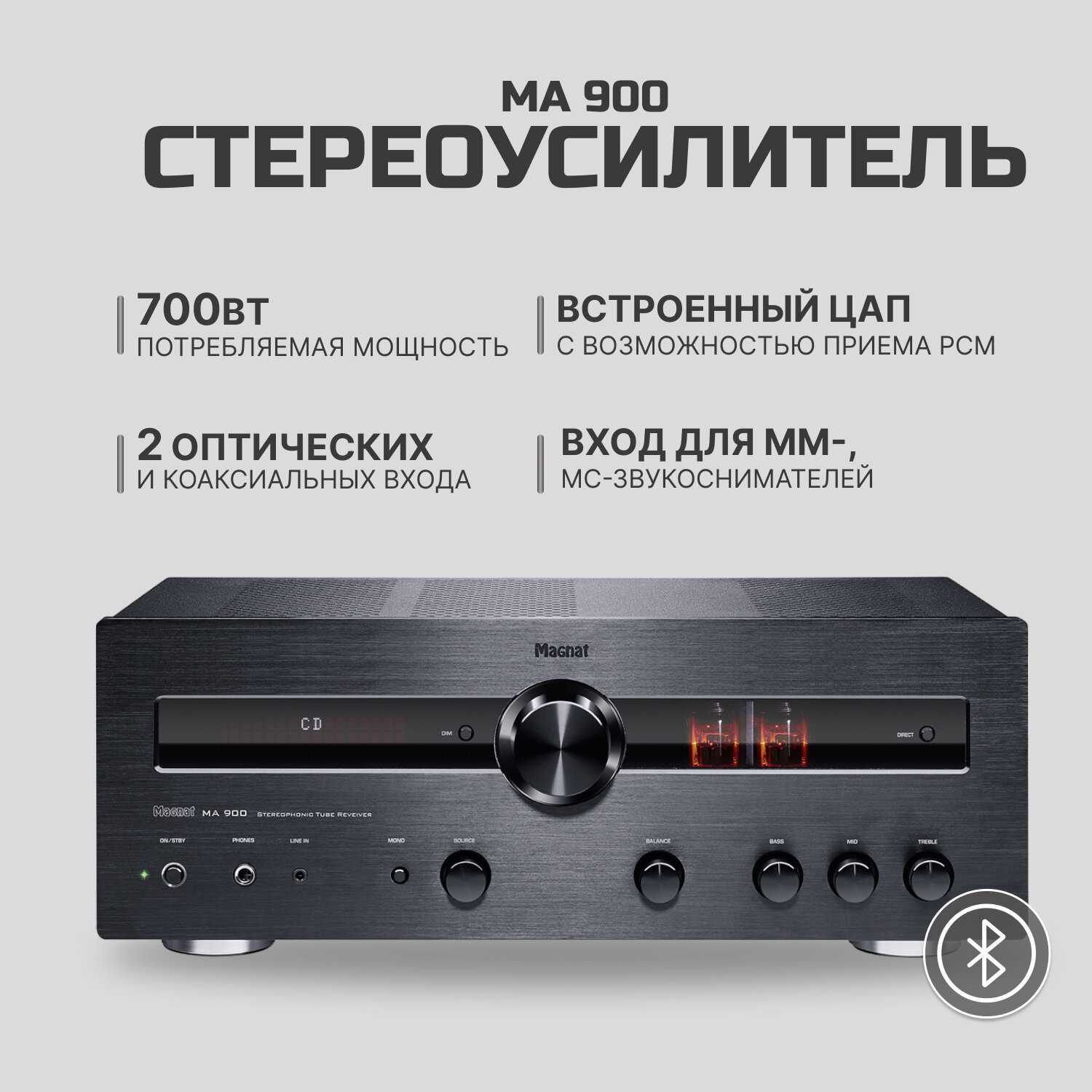 - + Трехполосный тембр-блок, встроенный фонокорректор MM/MC, Bluetooth.