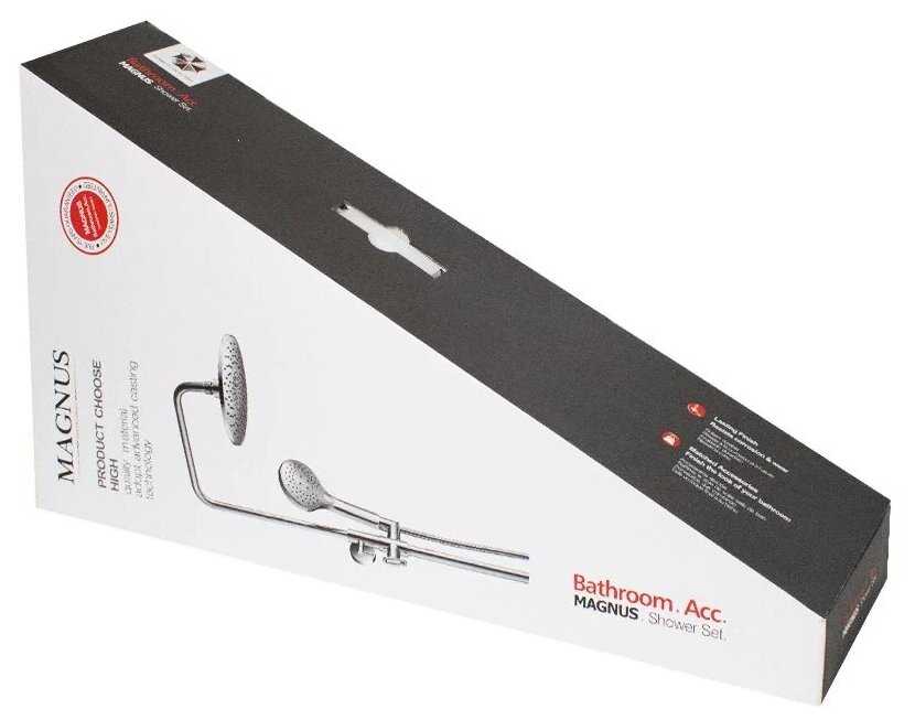 | Комплектация : | верхний душ, держатель лейки, дивертор, душевая штанга, лейка, переключатель потоков, прокладки, смеситель, шланг, эксцентрик |