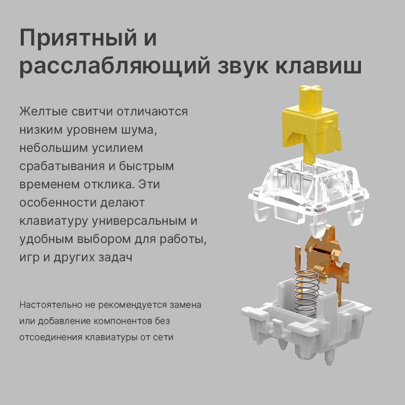 Очень понравились жёлтые свитчи. Думал о синих, но взял с желтыми и на удивление эти тоже очень понравились. - - Слегка тускловатый свет на самих буквах на клавишах, но это никак не мешает смотреть на клавиатуру.