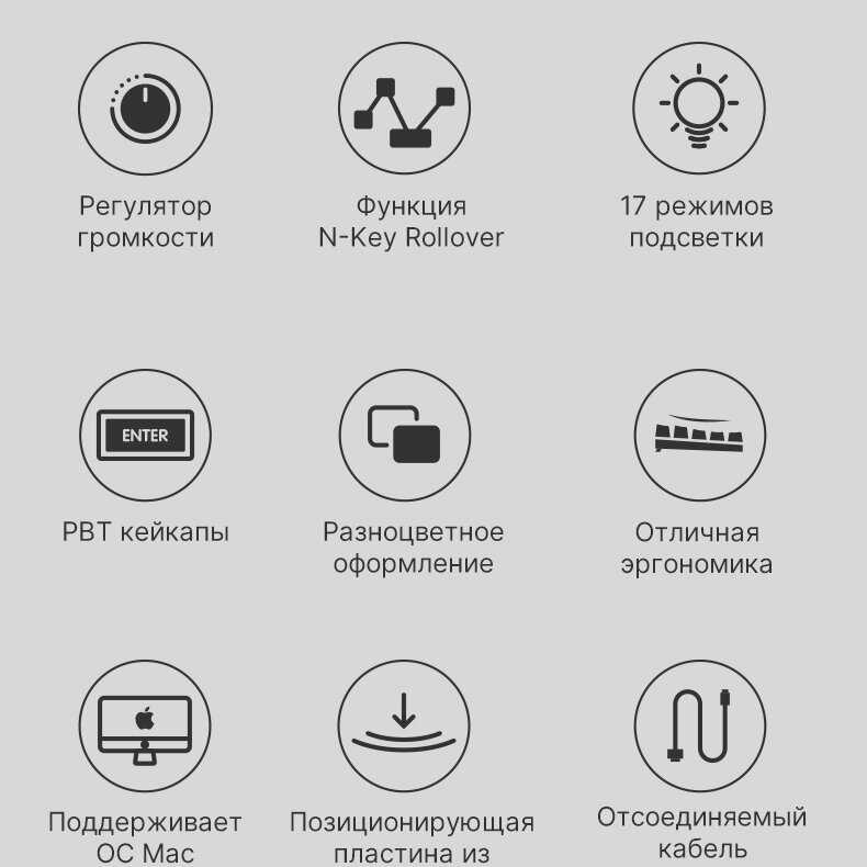 - + все кнопочки на месте, фулстак как говорится, режимы подсветки радуют своим колличеством, отдельно можно настраивать боковые подсветки и подсветку клавиш, очень удобная клава, советую