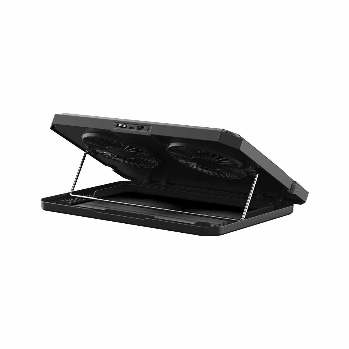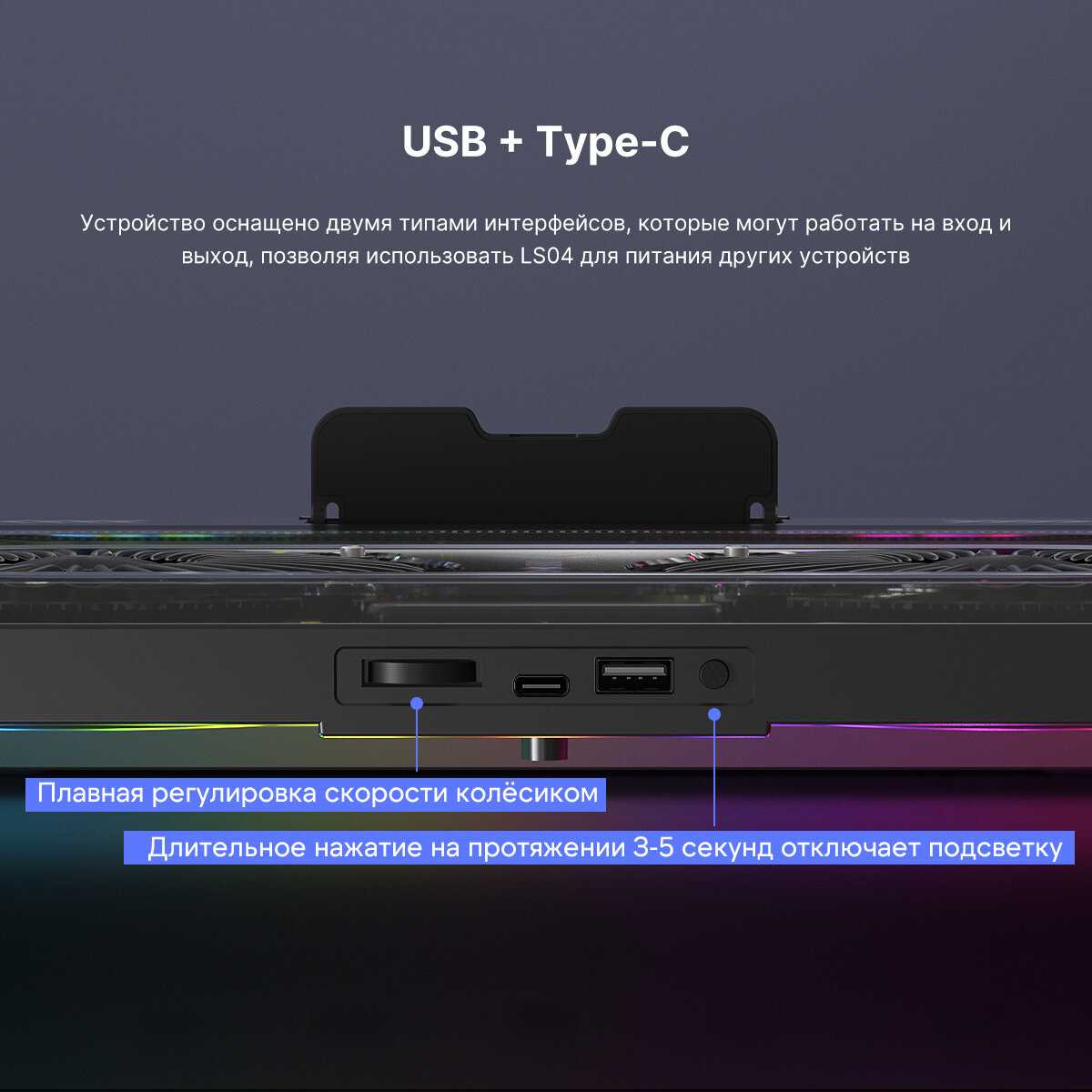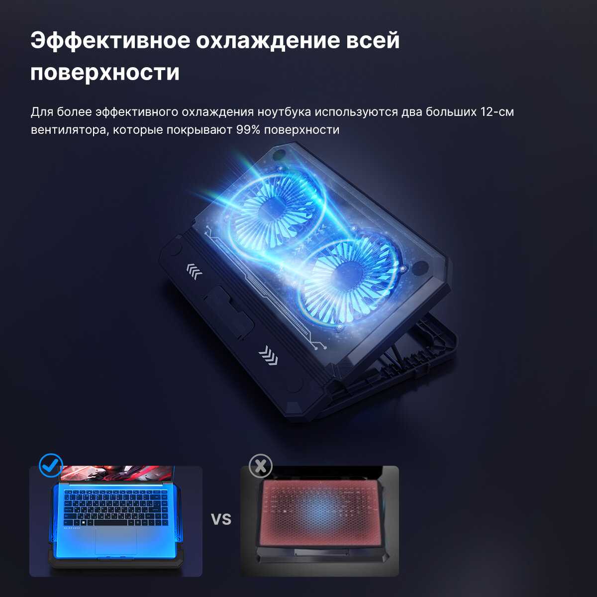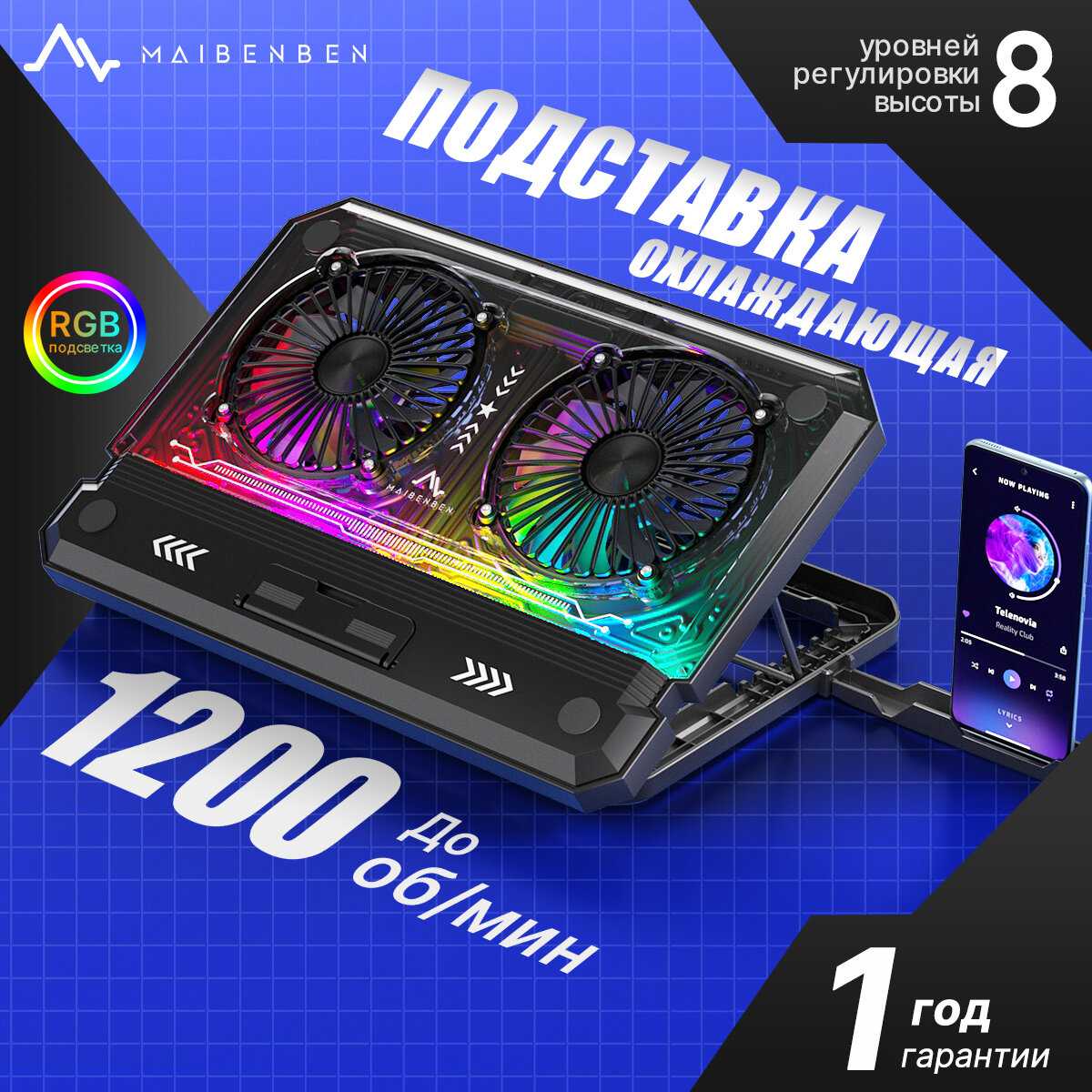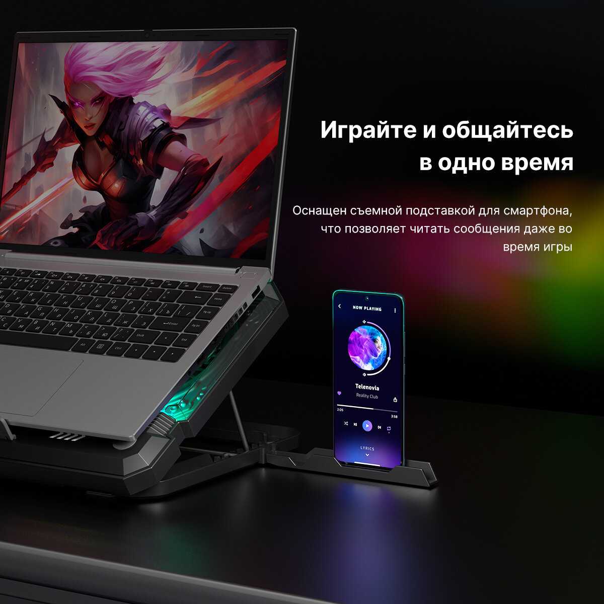 - + отличная подставка, регулируется, не шумная, есть подсветка и регулировка вращения вентиляторов сзади.