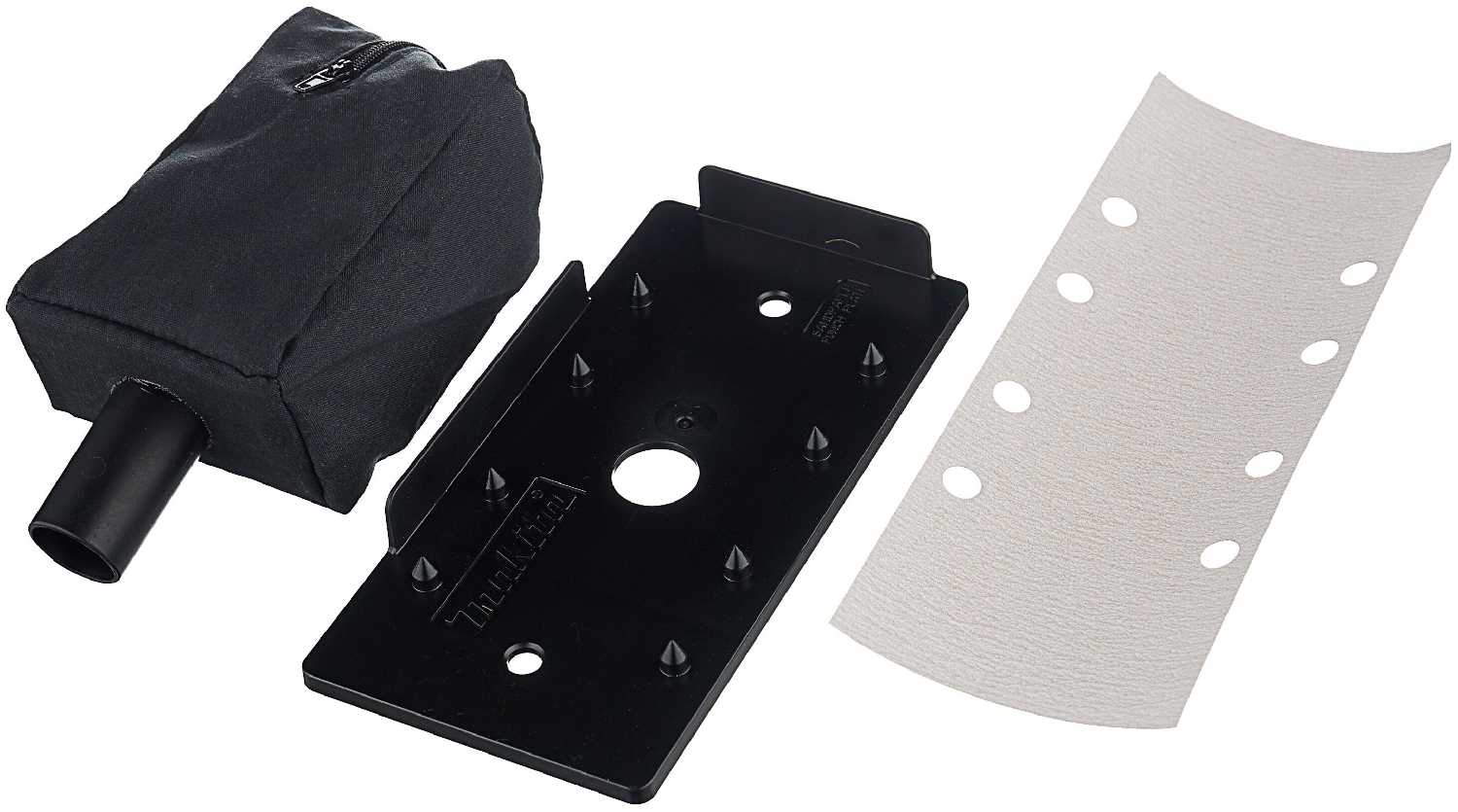 В комплекте есть 1 лист наждачки (120 grit), шаблон для дырокола, мешок для пыли. Мешок функционален, но не идеален (пыль просачивается). Сразу рекомендуют купить сменную подошву (как расходник) и переходник для пылесоса из-за нестандартного патрубка. -