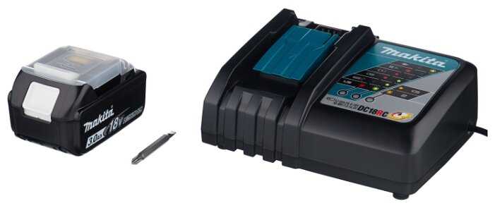 В комплекте идут зарядка DC18RC и два аккумулятора BL 1830B 18 В 3 Ач;