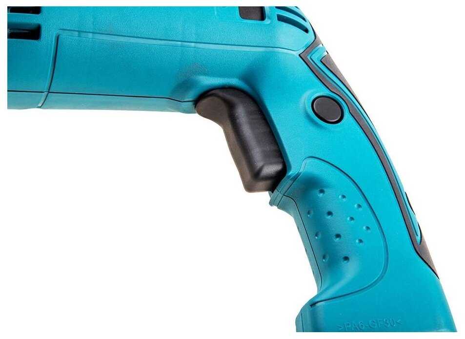 Дрель оснащена 13-мм патроном, ударным механизмом и реверсом. Ударный режим подходит для кратковременной работы с кирпичом или пеноблоками, но не заменяет перфоратор — при бурении бетона скорость падает, а износ шестерён увеличивается. Реверс реализован через смещение щёток на якоре, что исключает случайные переключения. Электронная регулировка оборотов (0–2800 об/мин) точнее аналогов с колесиком, но требует привыкания. Шнур длиной 2.5 м из морозостойкой резины не дубеет на холоде, однако его гибкость иногда мешает при перемещениях. Отсутствие быстрозажимного патрона и подсветки — минусы для любителей, но профессионалы ценят ключевой зажим за надёжность.