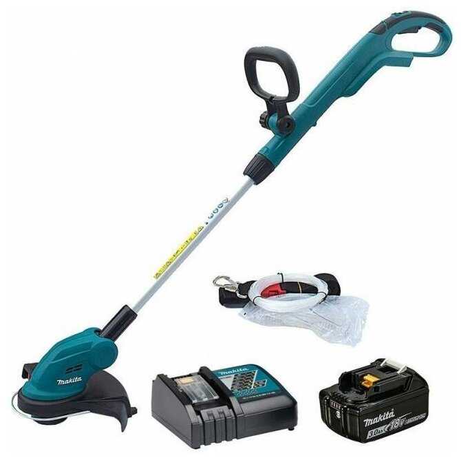 Стандартно включены: аккумулятор 3.0 А·ч, быстрое зарядное устройство с вентилятором, наплечный ремень с амортизацией, защитные очки, катушка с леской 1.65 мм и запасная леска. В некоторых партиях встречается леска 2 мм — это зависит от региона поставки.