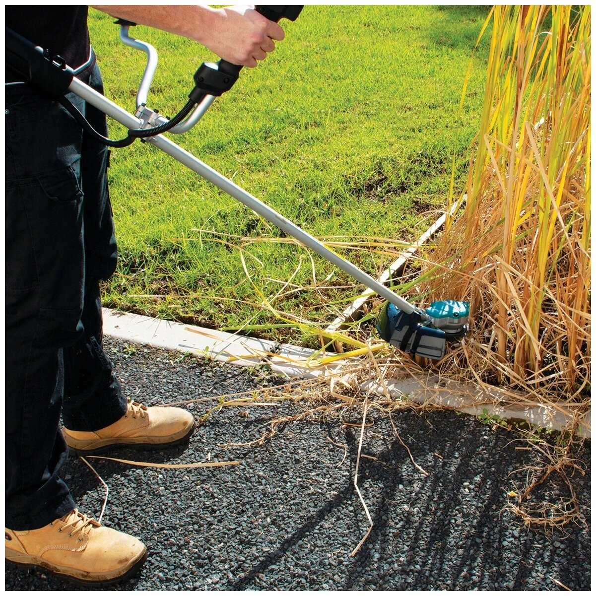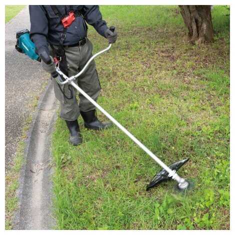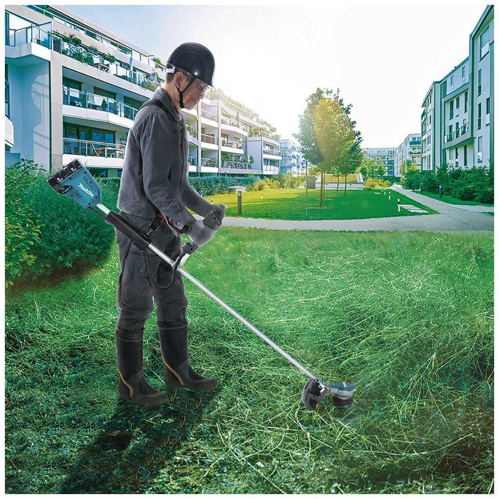 Модель Makita DUR368 демонстрирует сбалансированную мощность для стандартного ухода за участком: эффективно скашивает газонную траву и справляется с обочинами при использовании лески толщиной 2.4 мм. Пластиковые ножи, входящие в комплект, уверенно режут стебли толщиной до 1 см на ровных поверхностях, а металлический диск предназначен для густого бурьяна. Пользователи отмечают, что на третьей скорости триммер работает как "бритва", хотя при обработке высокой влажной травы возможен перегрев с активацией защиты. Автоматический режим ADT (автоматическая регулировка оборотов под нагрузкой) воспринимается неоднозначно: часть владельцев считает его полезным, другие предпочитают ручной выбор скорости. В сравнении с бензиновыми аналогами (Echo SRM-22, Stihl FS 55) мощность ниже, что ощущается при кошении запущенных участков.