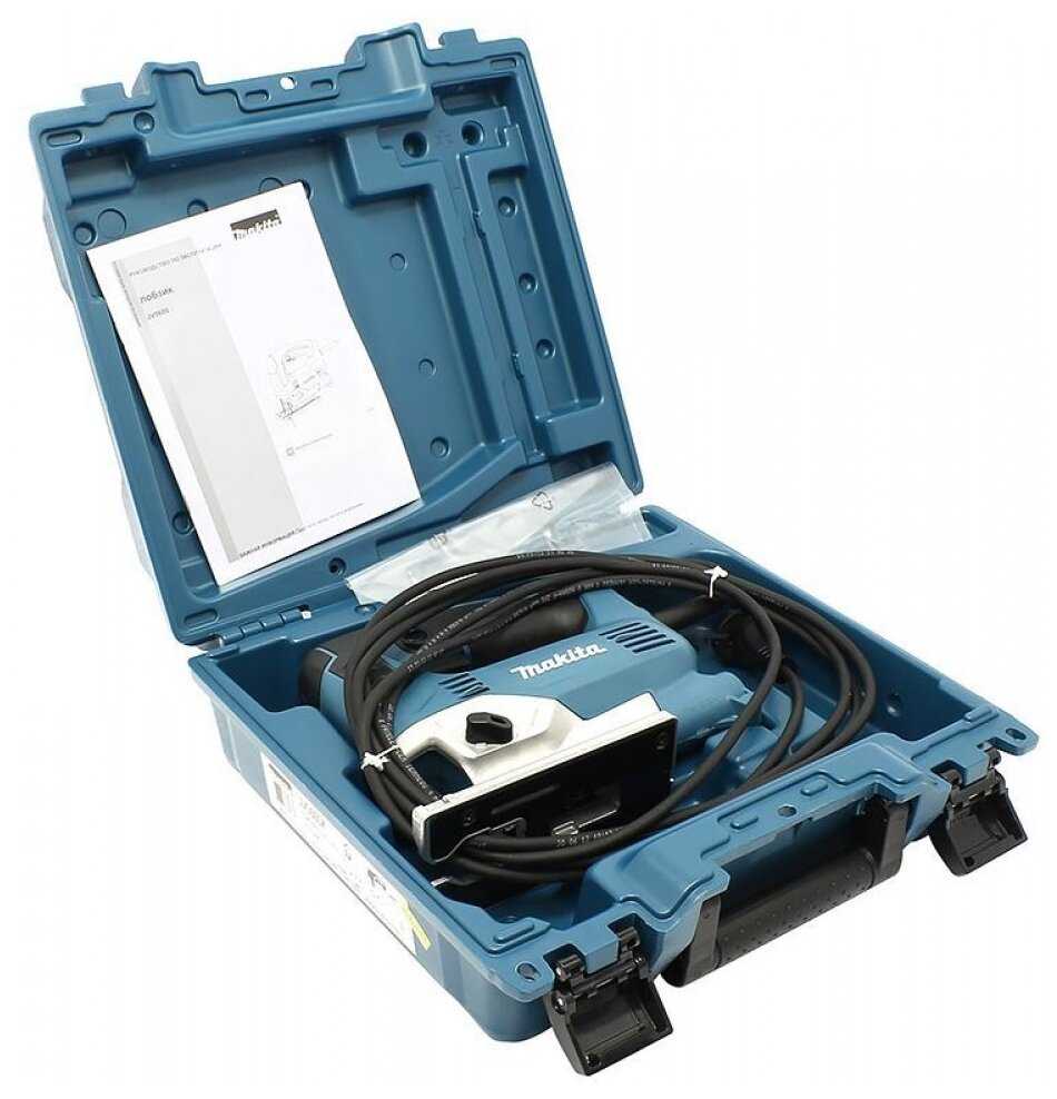 Стандартная поставка включает пластиковый кейс с отделениями для мелочей, одну пилку по дереву и шестигранник. Защитная прозрачная накладка на пилку и антицарапающая пластиковая подошва отсутствуют – их можно докупить отдельно для модели Makita 4350CT.