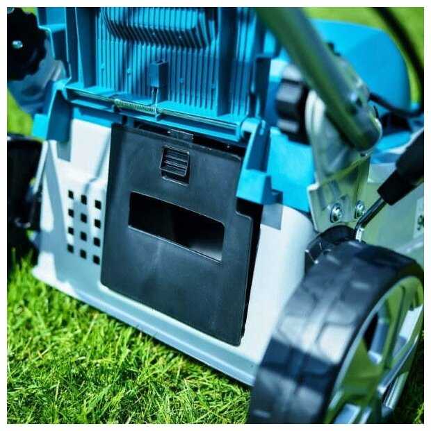 Дополнительная информация : | Двойная изоляция, наличие корзины для сбора травы с индикатором наполняемости, возможность установки заглушки для мульчирования отходов, возможность блокировки задних колес |