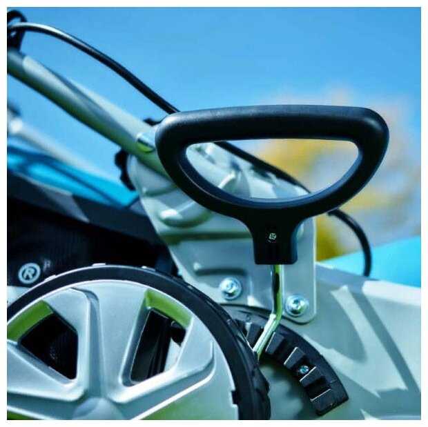 Центральный рычаг позволяет быстро менять высоту среза (25-75 мм) одним движением даже во время работы. На минимальной настройке косилка фактически "бреет" грунт, что полезно для борьбы с сорняками, но требует идеально ровной поверхности без камней. -