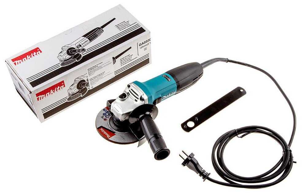 Стандартная комплектация включает съёмную боковую рукоятку (устанавливается справа или слева), ключ для замены дисков из толстого металла и шлифовальный диск Makita. Отсутствие кейса (кроме версии GA5030K) пользователи считают преимуществом — это позволяет подобрать индивидуальный ящик для хранения болгарки с кожухом, дисками и СИЗ. Ручка обеспечивает дополнительный контроль при силовых работах, хотя многие предпочитают обходиться без неё благодаря удобному хвату корпуса. Ключ надёжен, но некоторые пользователи затягивают гайки вручную.