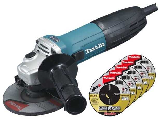 Базовый комплект включает только зачистной диск и ключи, но в версии GA5030K добавлены 5 отрезных дисков и кейс с отделением для оснастки. Ящик критикуют за хлипкие защёлки, неудобную систему укладки (инструмент фиксируется только в одном положении с перегибом кабеля) и бесполезный карман-«сюрприз» без конкретного назначения. Пользователи советуют докупить быстрозажимную гайку Makita 192567-3 — она ускоряет замену дисков и снижает риск перекоса оснастки. Для профессионального использования рекомендуется антивибрационная рукоятка 194514-0, но её цена сопоставима с 30% стоимости самой болгарки. Отдельный плюс — совместимость с оригинальными аксессуарами Makita, включая алмазные диски для керамогранита.