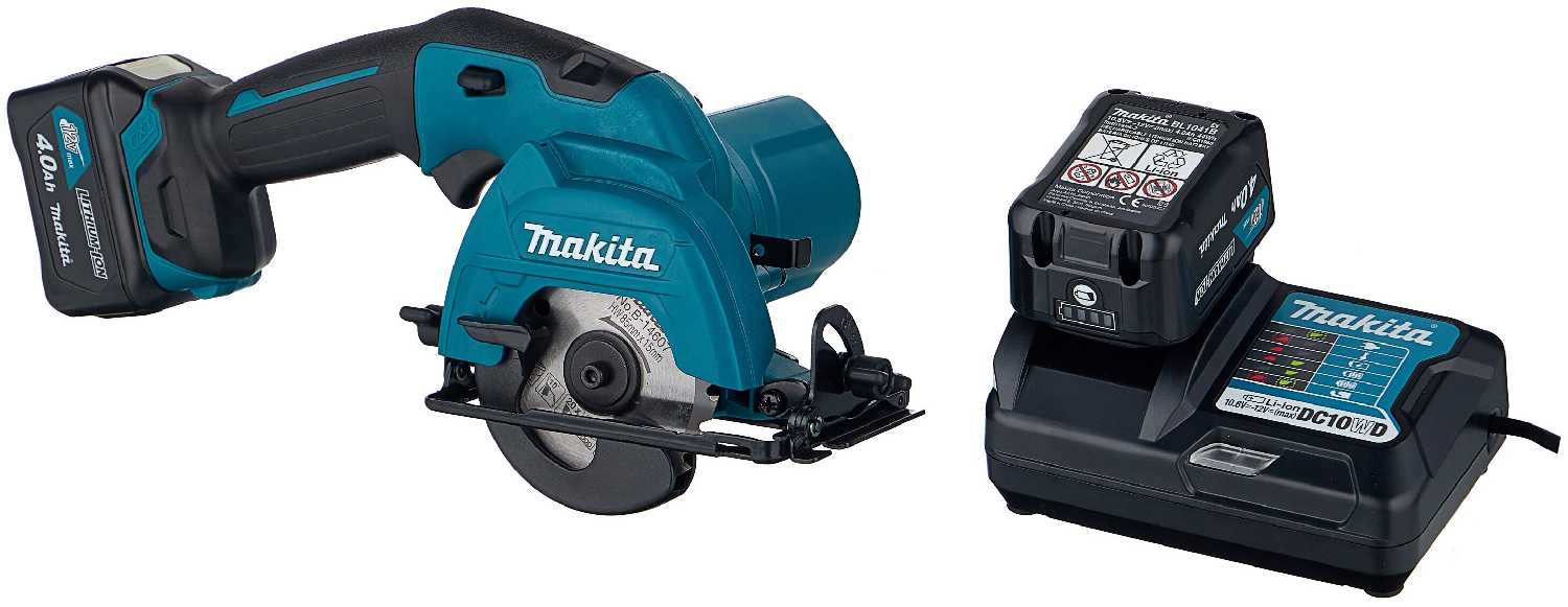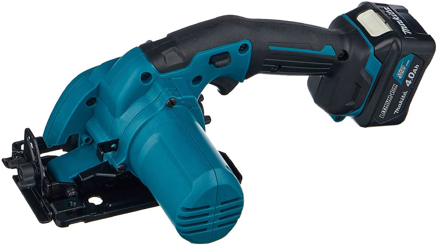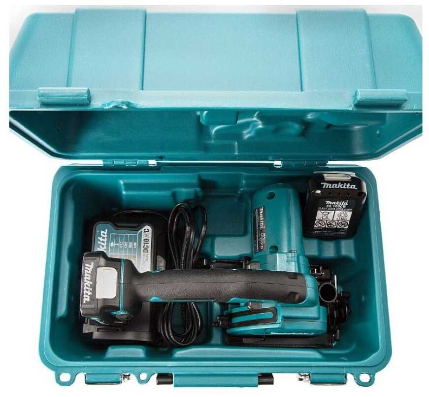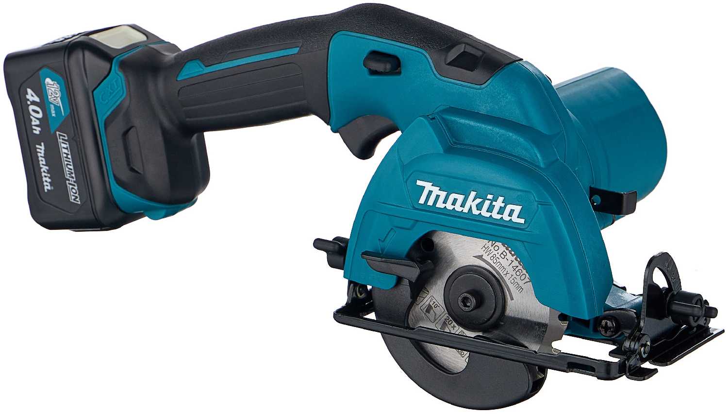 С АКБ 4 Ач время непрерывной работы — 2-3 часа при умеренной нагрузке (раскрой вагонки, ламината). Пиление многослойной фанеры сокращает ресурс. Критичен момент заклинивания диска: при несвоевременном отпускании кнопки аккумулятор может перегреться и выйти из строя. Совместима с АКБ от инструментов серии 12V Makita. -