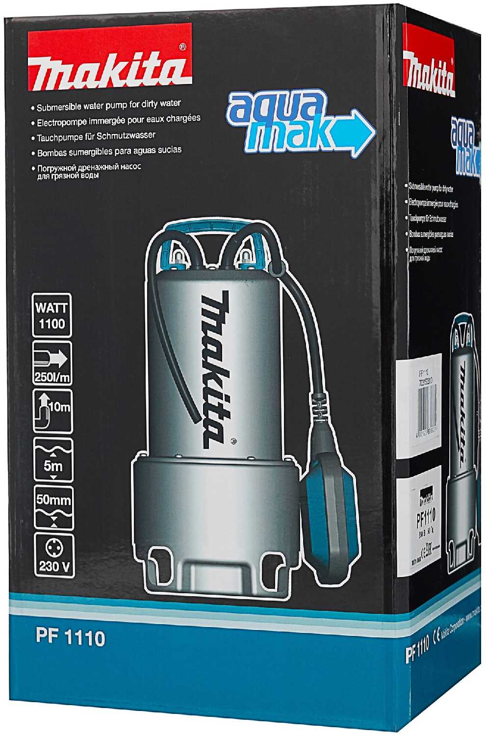 | Дополнительная информация : | Погружной дренажный насос MAKITA PF1110 предназначен для откачивания грязной воды из затопленных подвалов, колодцев. С его помощью так же можно организовать полив огорода или перегнать чистую воду из одного резервуара в другой. Максимальный поток 15.000 л/ч |