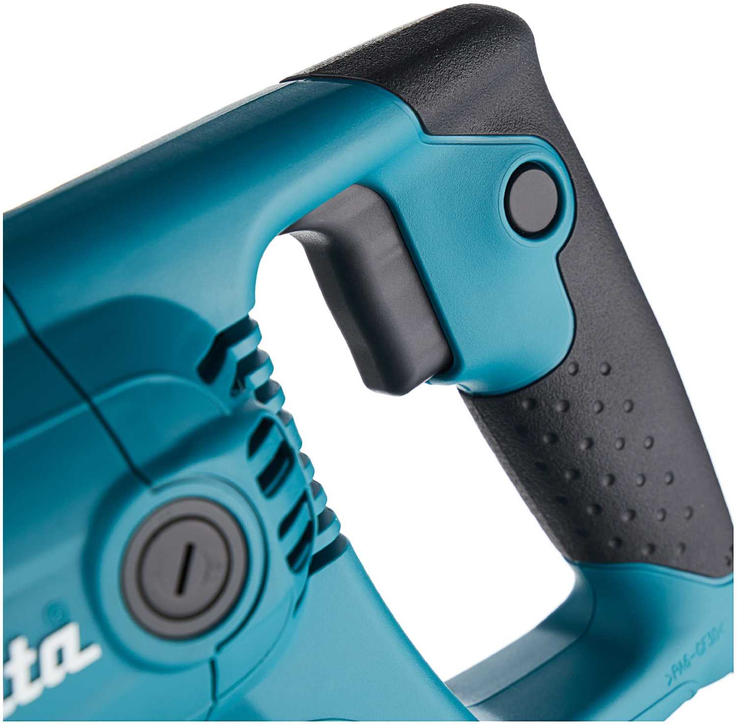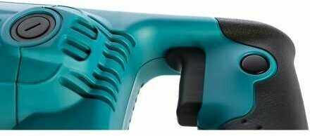 - - Кнопка фиксации оборотов на рукояти, расположена рядом с клавишей включения-выключения, из-за чего происходит непроизвольная остановка пилы.
