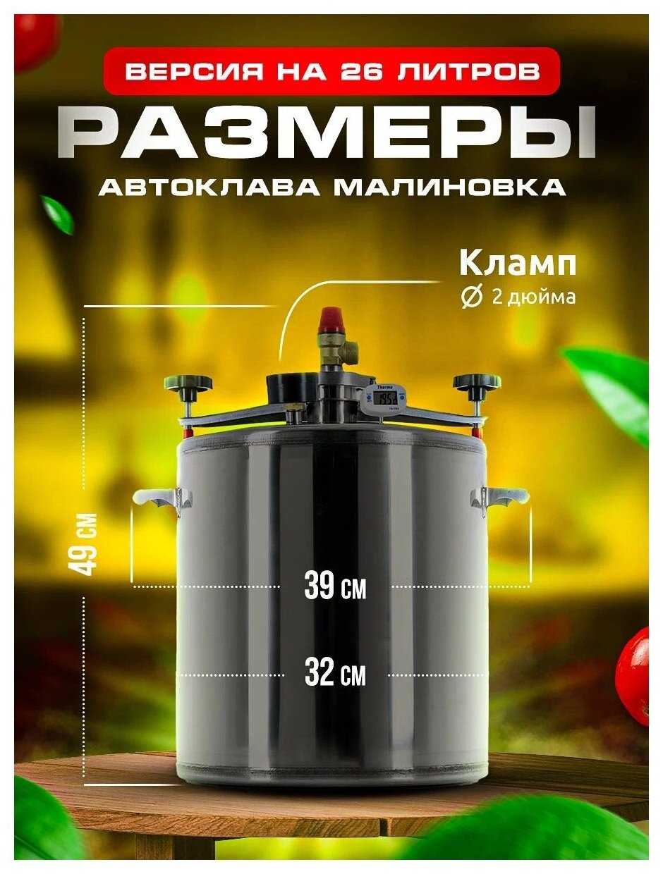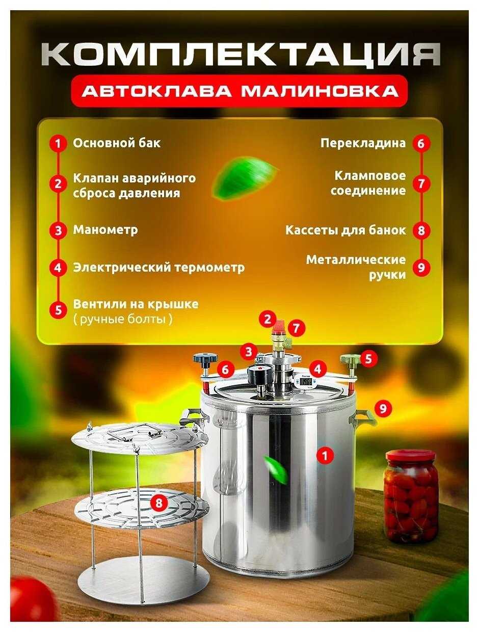 Подробная комплектация : | бак 26 литров из пищевой нержавеющей стали - 1 шт, кассеты - 3 шт, крышка Power inside - 1 шт, прокладка для крышки - 1 шт, перекладина для фиксации крышки - 1шт, вентили для перекладины крышки (ручные болты) - 2 шт, клапан аварийного сброса давления на 3 Бар. - 1 шт, кран сливной - 1 шт, хомут для клампового соединения - 1 шт, термометр - 1 шт, манометр - 1 шт, инструкция - 1 шт, гарантийный талон - 1 шт |
