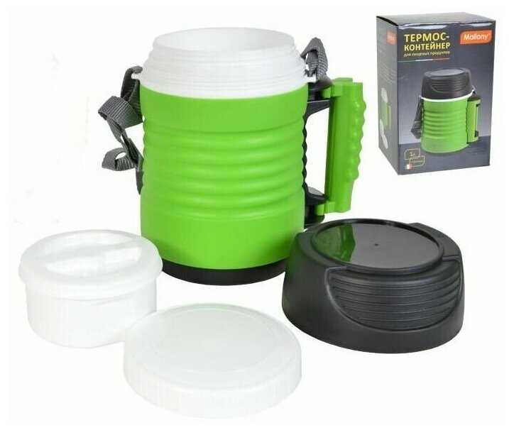 Дополнительная информация : | объем 1, 2 л, корпус из полипропилена, колба из нержавеющей стали (304), в комплекте две дополнительные миски с крышками (430 мл и 180 мл), пенополиуретановая изоляция, крышка-чашка, выдвижная ручка для переноски, ширина горла 11 см, не подходит для первых блюд, упаковка – цветная коробка |