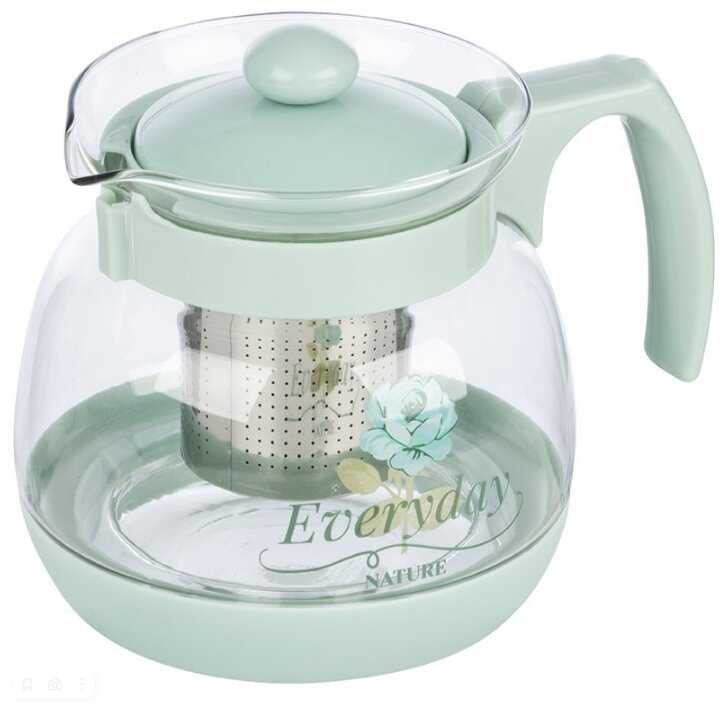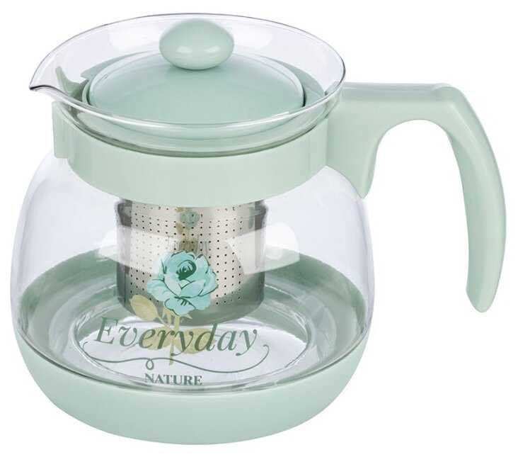 | Дополнительная информация : | Чайник выполнен из прозрачного жаропрочного стекла, имеет круглый корпус с широким основанием и высоким снабженным ручкой верхним фацетом для заливания. Внутри чайника расположен металлический фильтр с отверстиями, дополнительно украшенный изображением синизеленой розы и листьями, а также надписью everyday и nature. Фильтр вставлен в горлышко чайника и расположен по центру. |