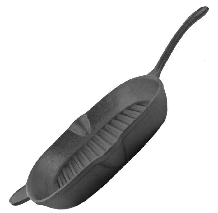 - + Чугунная, тяжелая, настоящая, борозды широкие, мясо на нем получается очень красивое как и рыба.