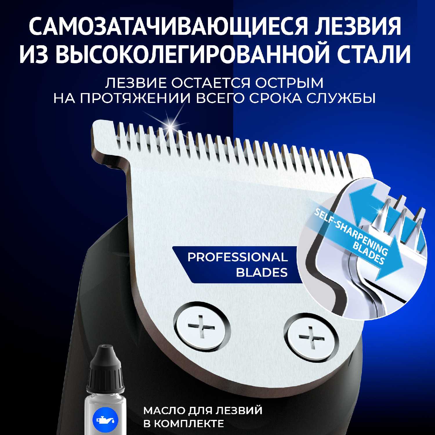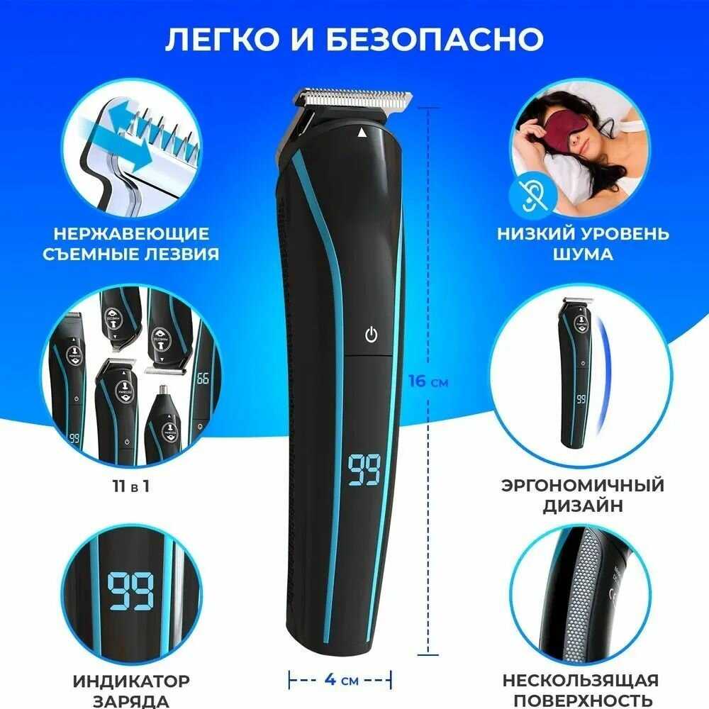 - Включает специализированные насадки для бороды, усов и тела, а также шаблон для точного оформления линий.