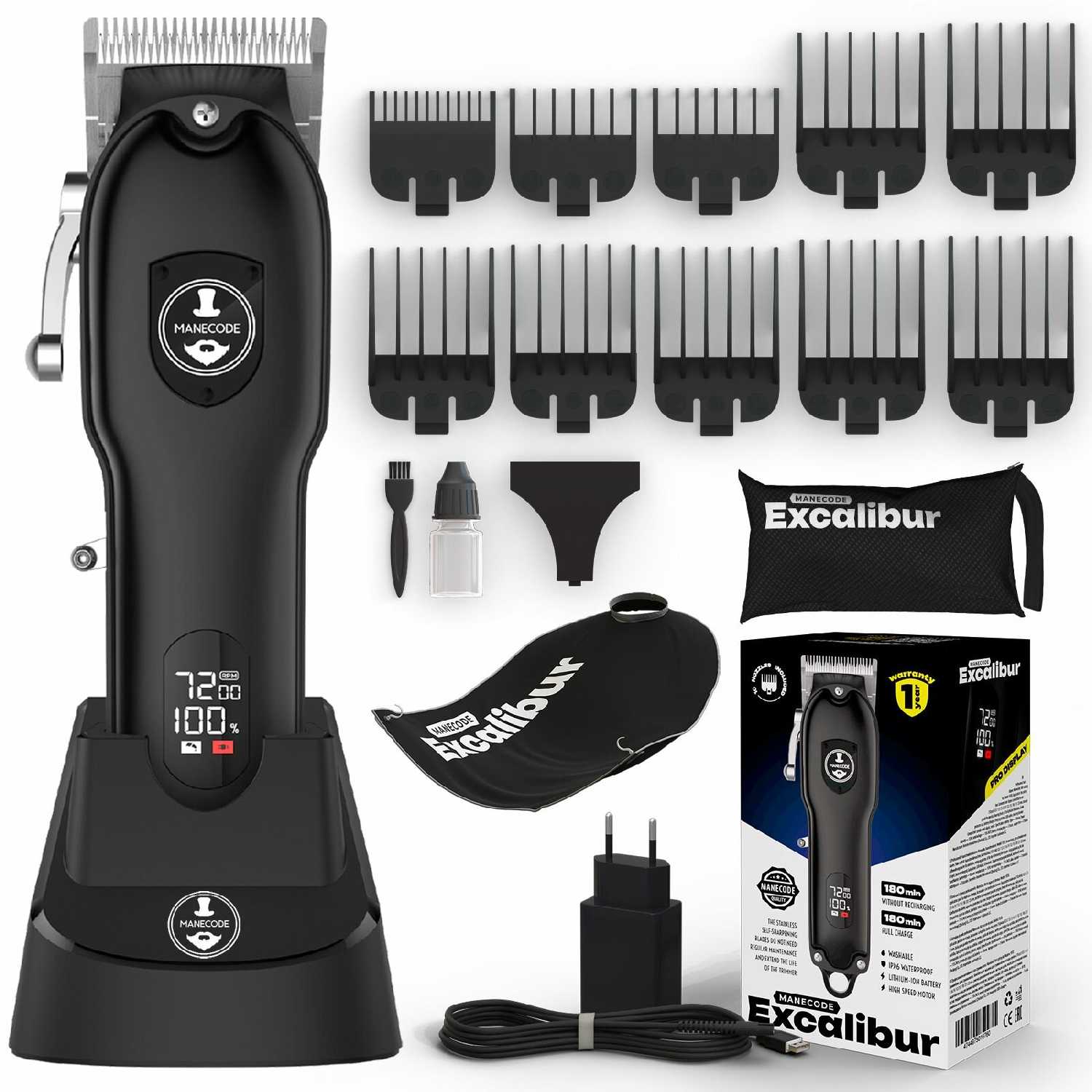 - + Машинка Manecode Excalibur стрижёт быстро и ровно, даже если волосы густые или жёсткие. Удобно лежит в руке, не шумит и не дерет кожу при стрижке – отличный выбор и для дома, и для мастера. Еще много насадок.