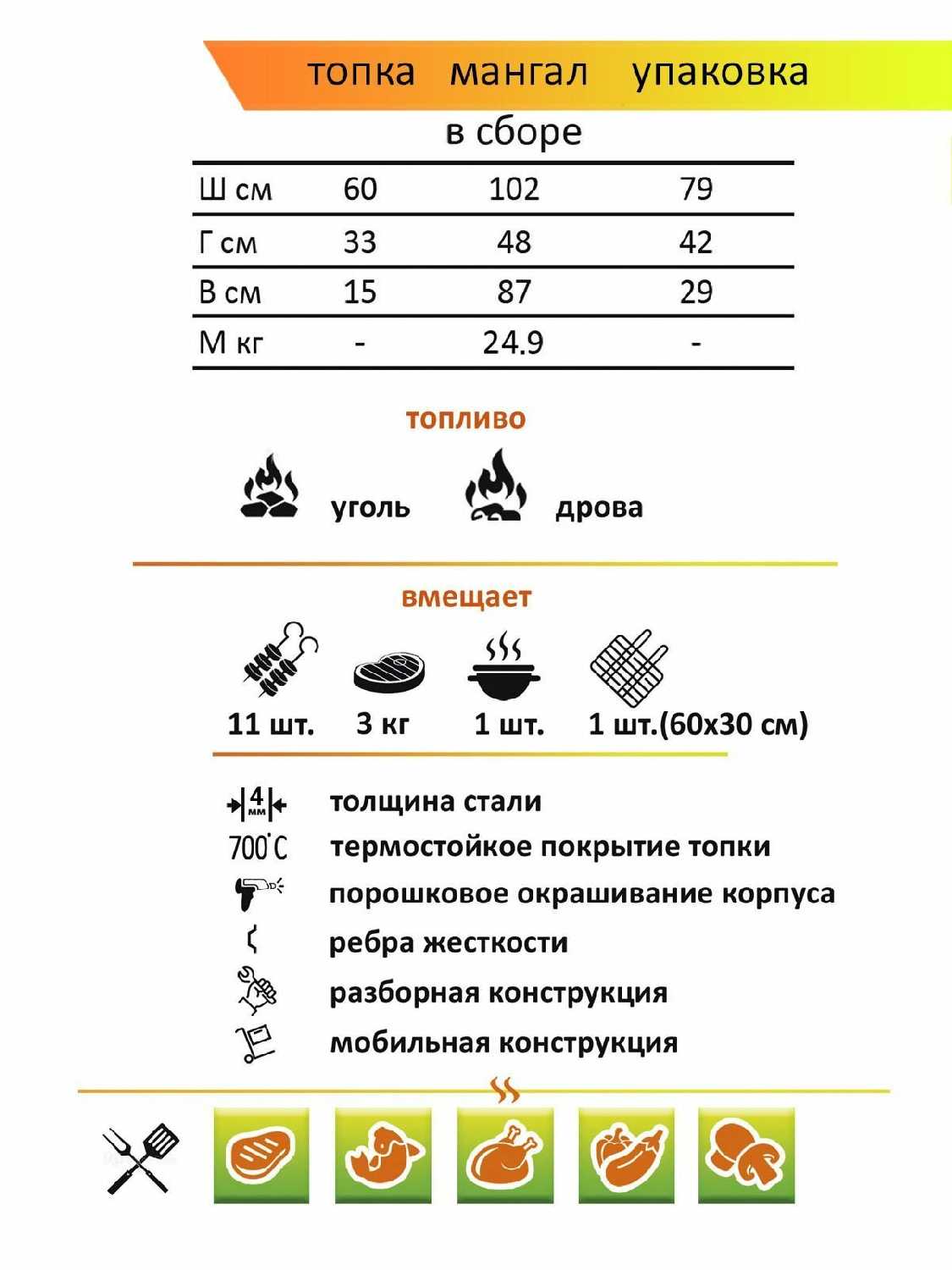 - Отличный мангал! Мангал превзошел все ожидания. Мясо прожаривается равномерно, глубина жаровни оптимальная. Порошковая краска выдержала нагрев без проблем. Все детали идеально п...