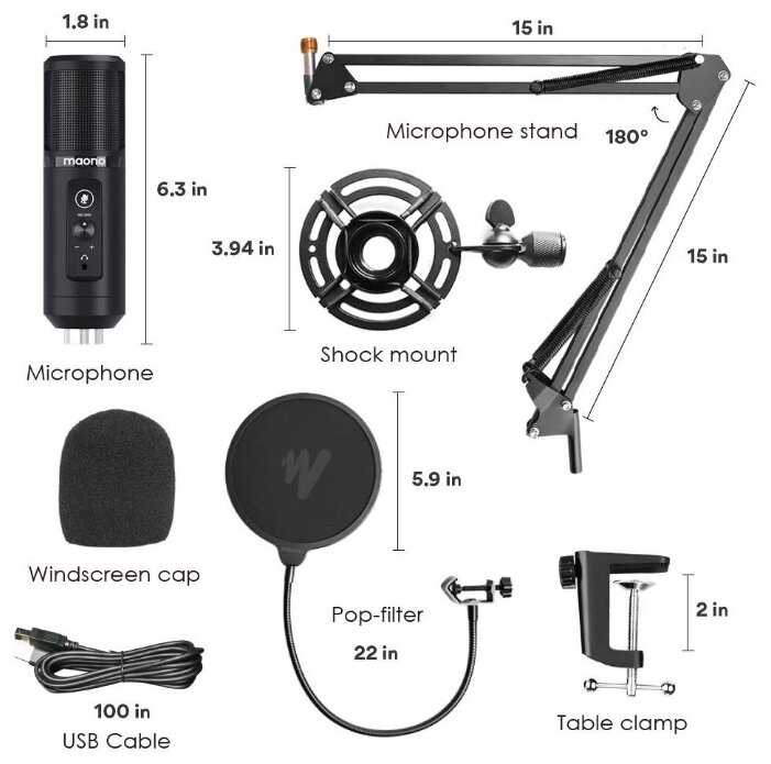 - В комплекте есть поп-фильтр, металлический паук (антивибрационное крепление) и регулируемая стойка, что избавляет от необходимости докупать аксессуары.