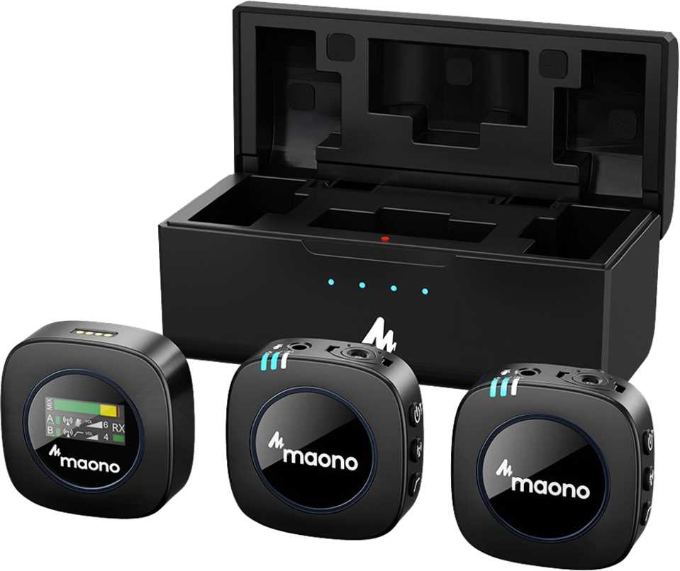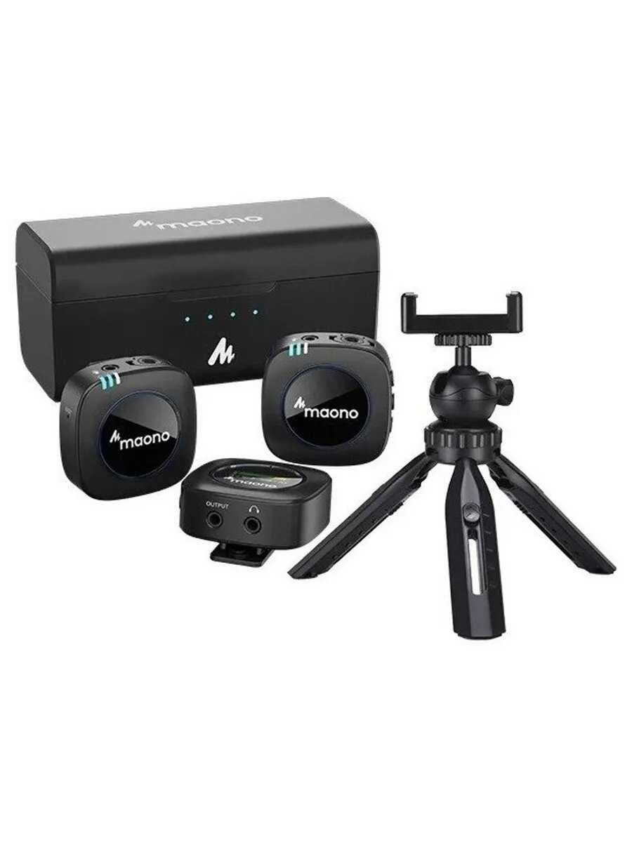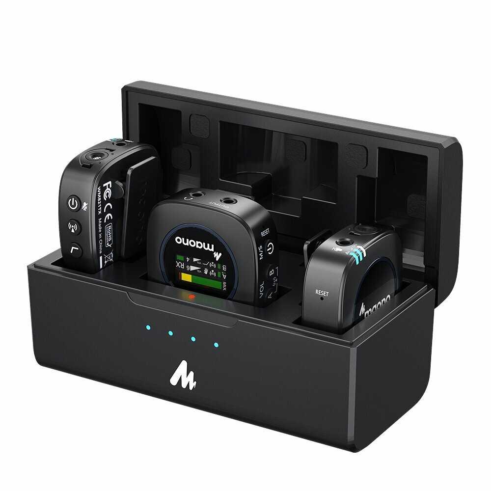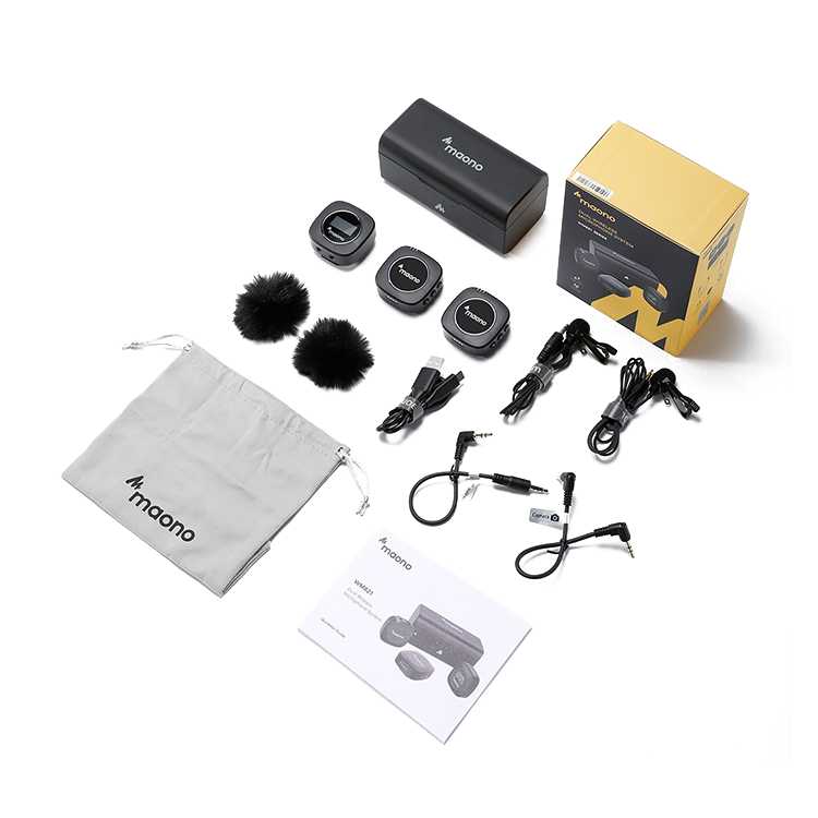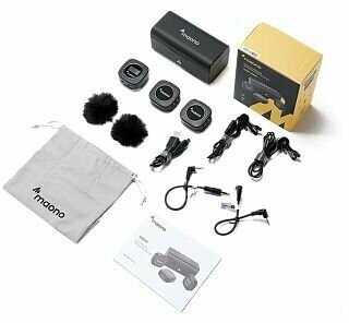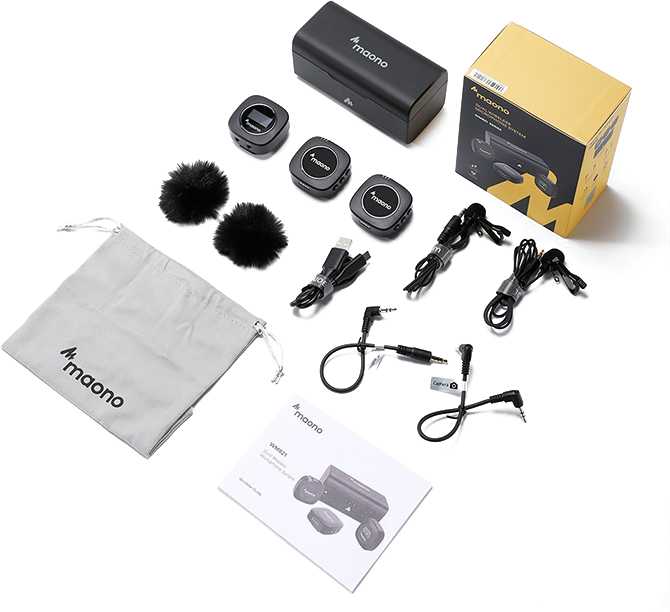 2 микрофона, 2 передатчика, аудиокабель х2, ветрозащита x2, документация, зарядный футляр, приемник, чехол