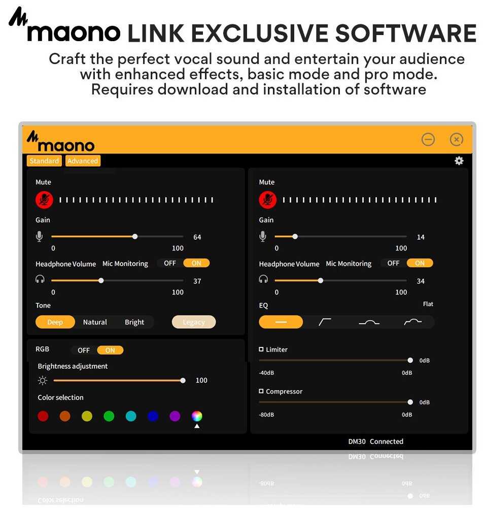 - Фирменное ПО MAONO Link предоставляет 3 пресета эквалайзера, компрессор и лимитер.