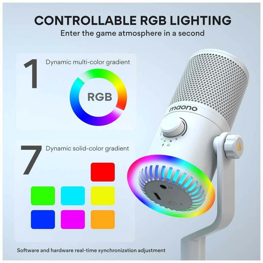 Подсветка регулируется кнопкой на корпусе: 7 статических цветов, режим перелива или полное отключение. Управление через Maono Link расширяет варианты, но цветовая палитра ограничена — нельзя задать произвольный оттенок. Яркость не регулируется, а в режиме "дыхания" переключение между цветами плавное. Для стримов в темноте свечение ненавязчиво. -