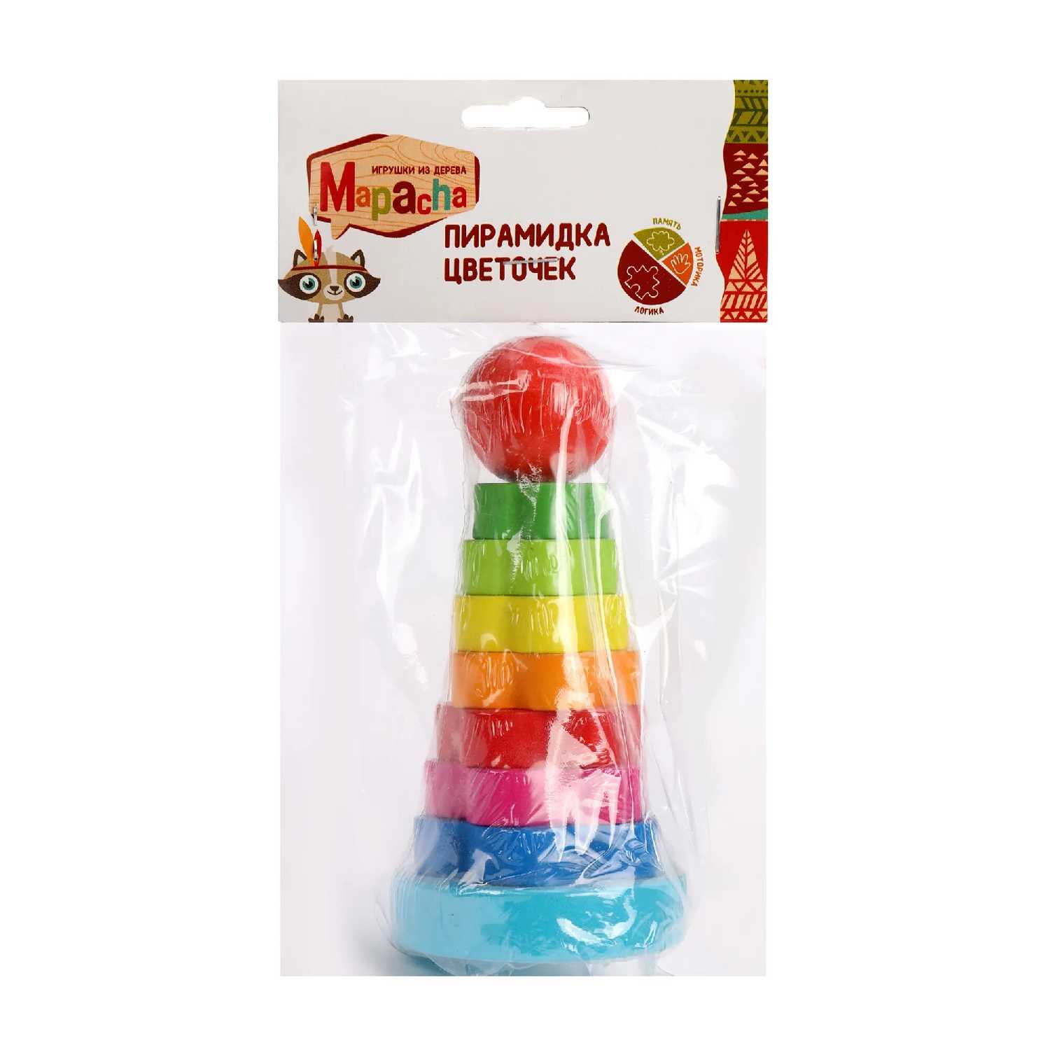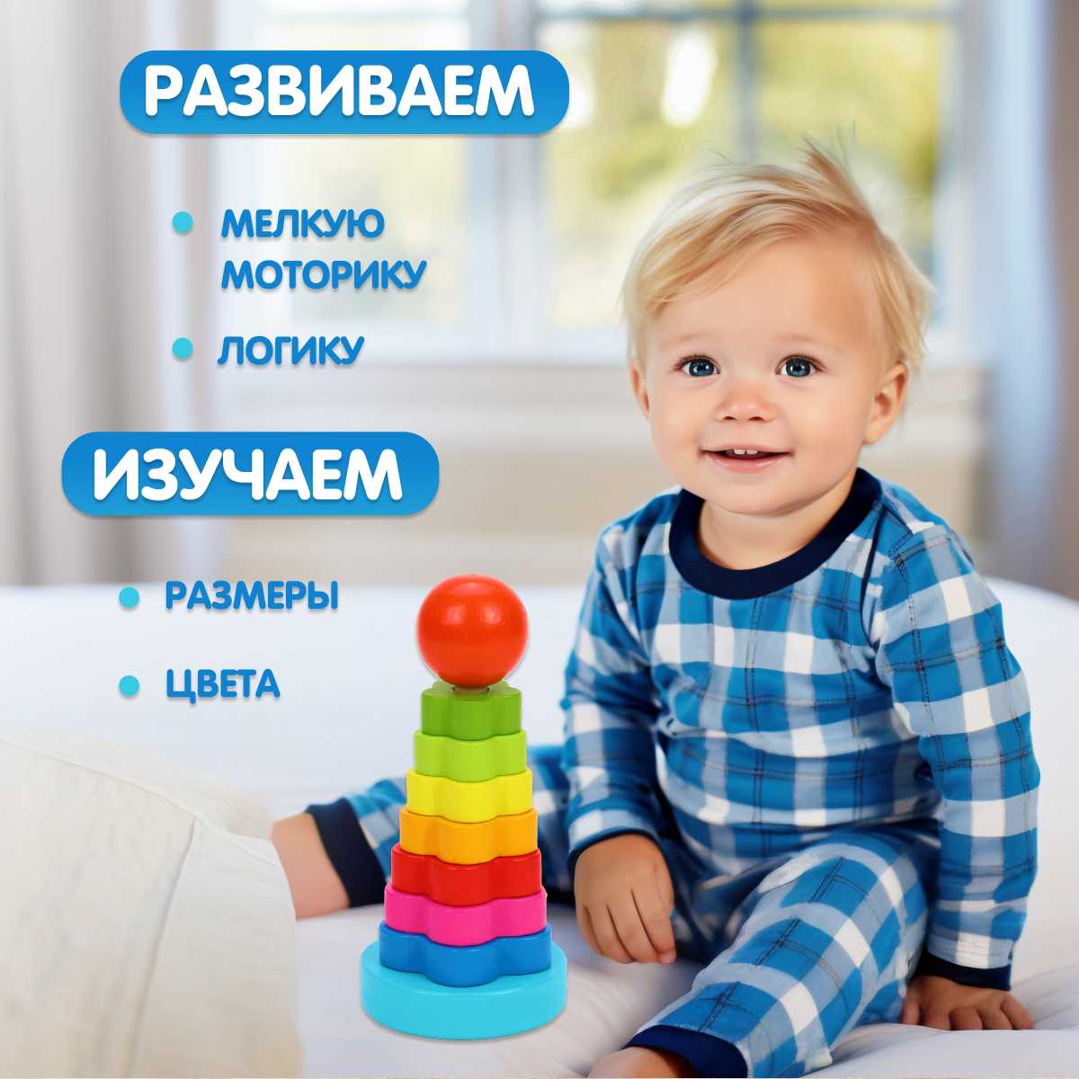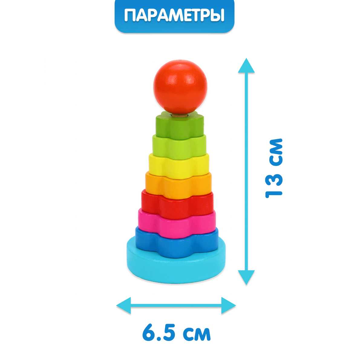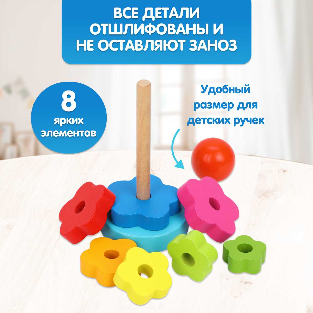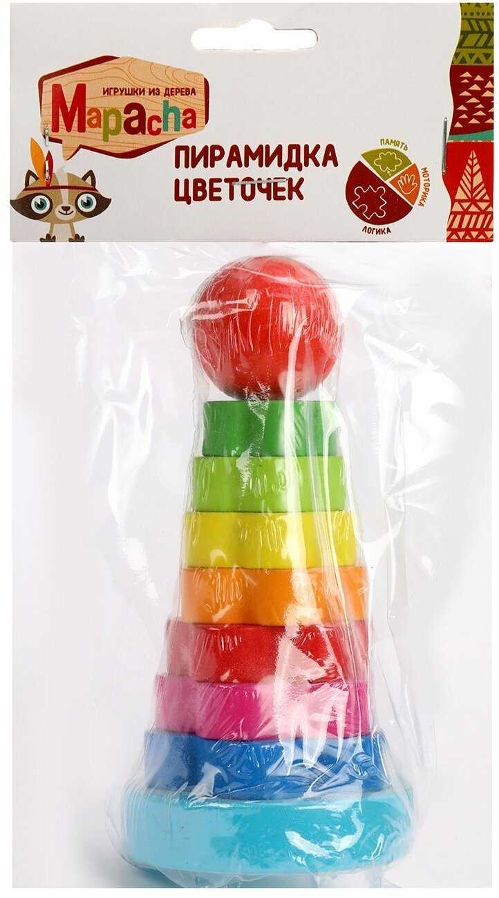 Комплектация : | Основа для нанизывания деталей пирамидки - 1 шт, разноцветные "цветочки" - 7 шт, шар - 1 шт |
