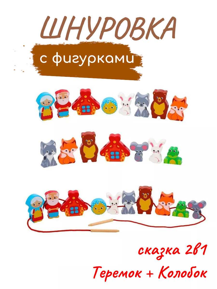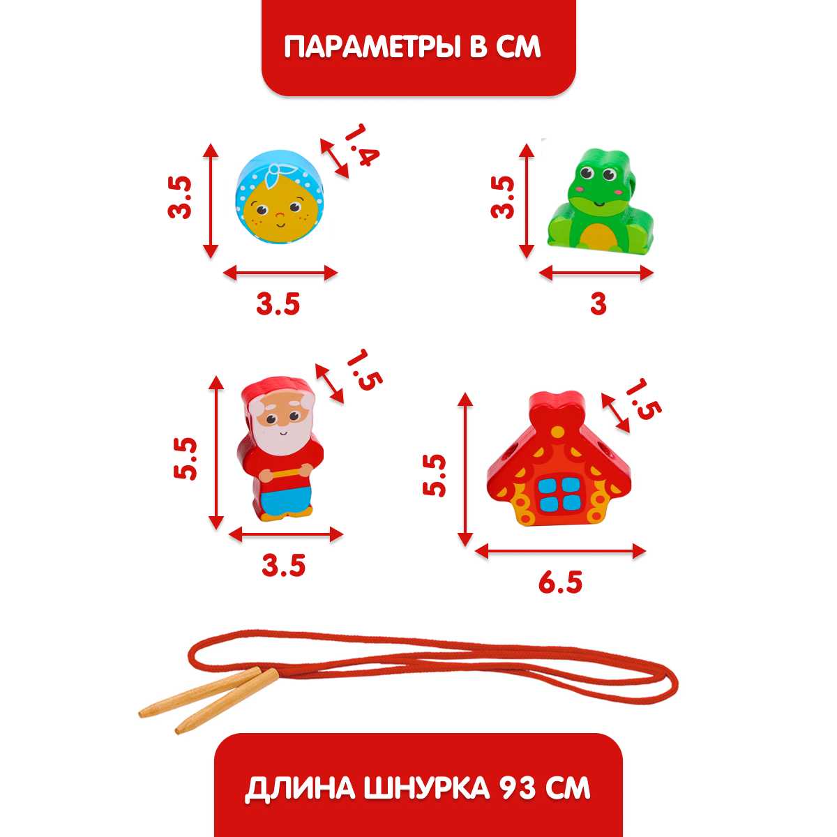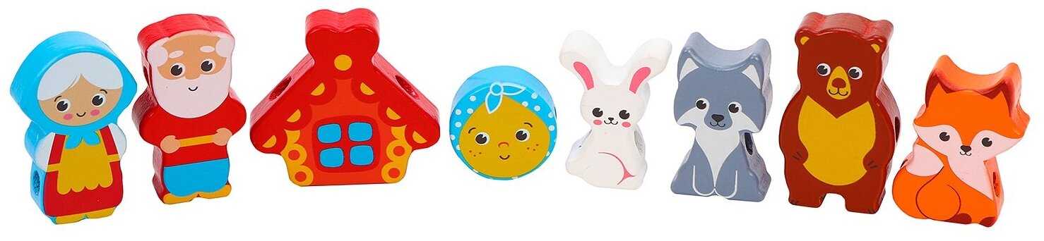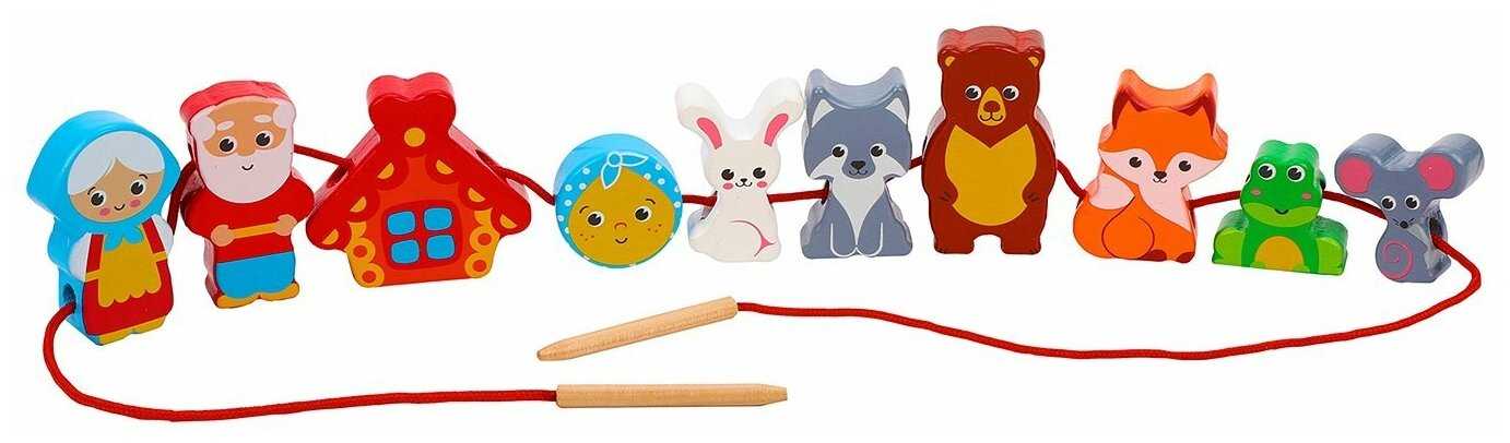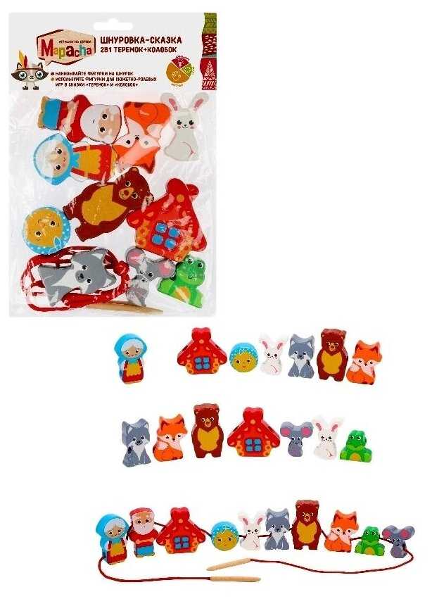 - + Замечательная игрушка. Деревянная, тщательно обработанная шнуровка. Персонажи сразу двух сказок красочные и очень милые.