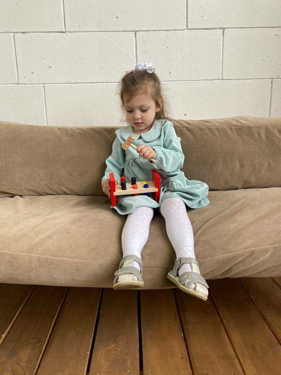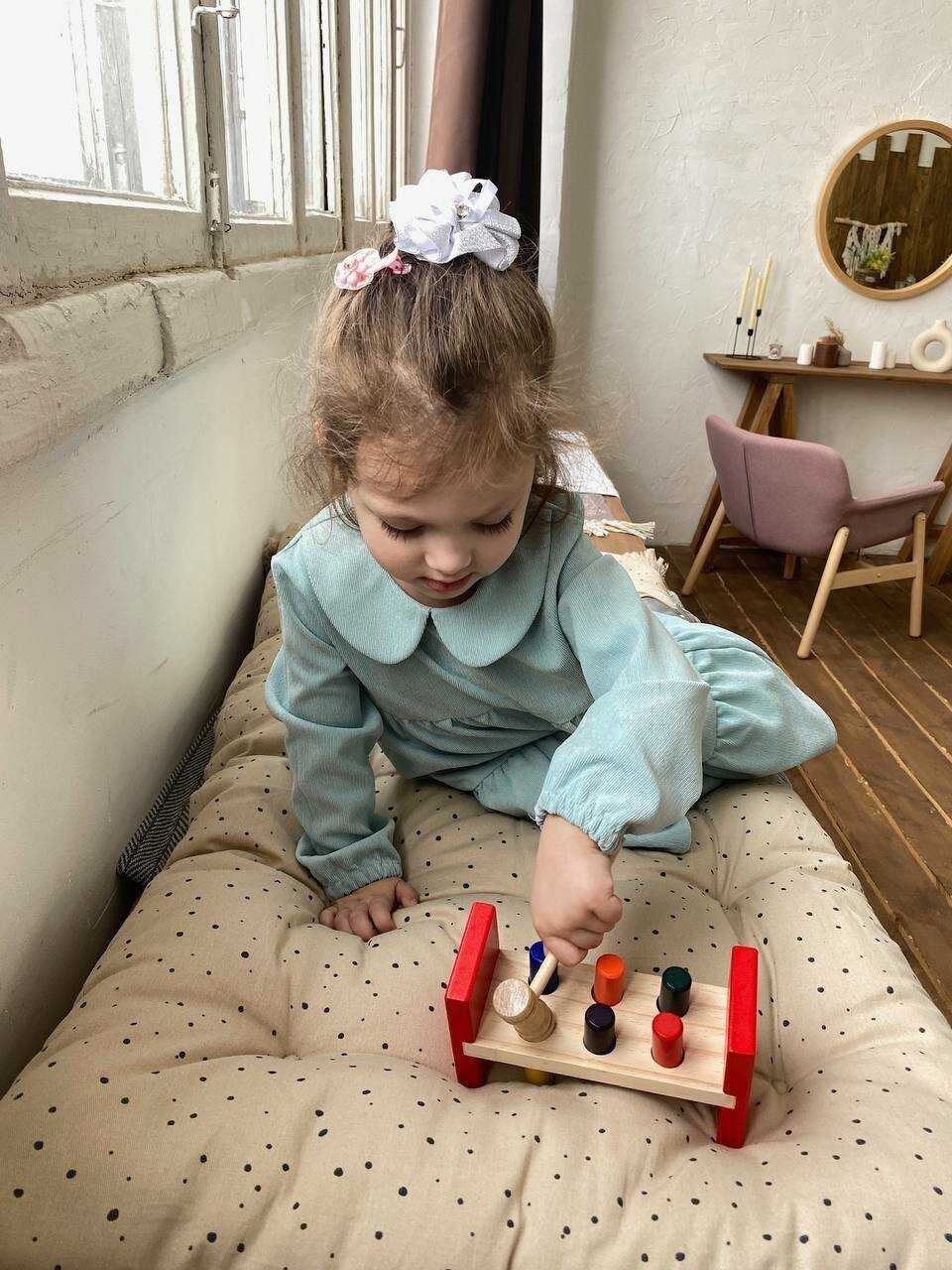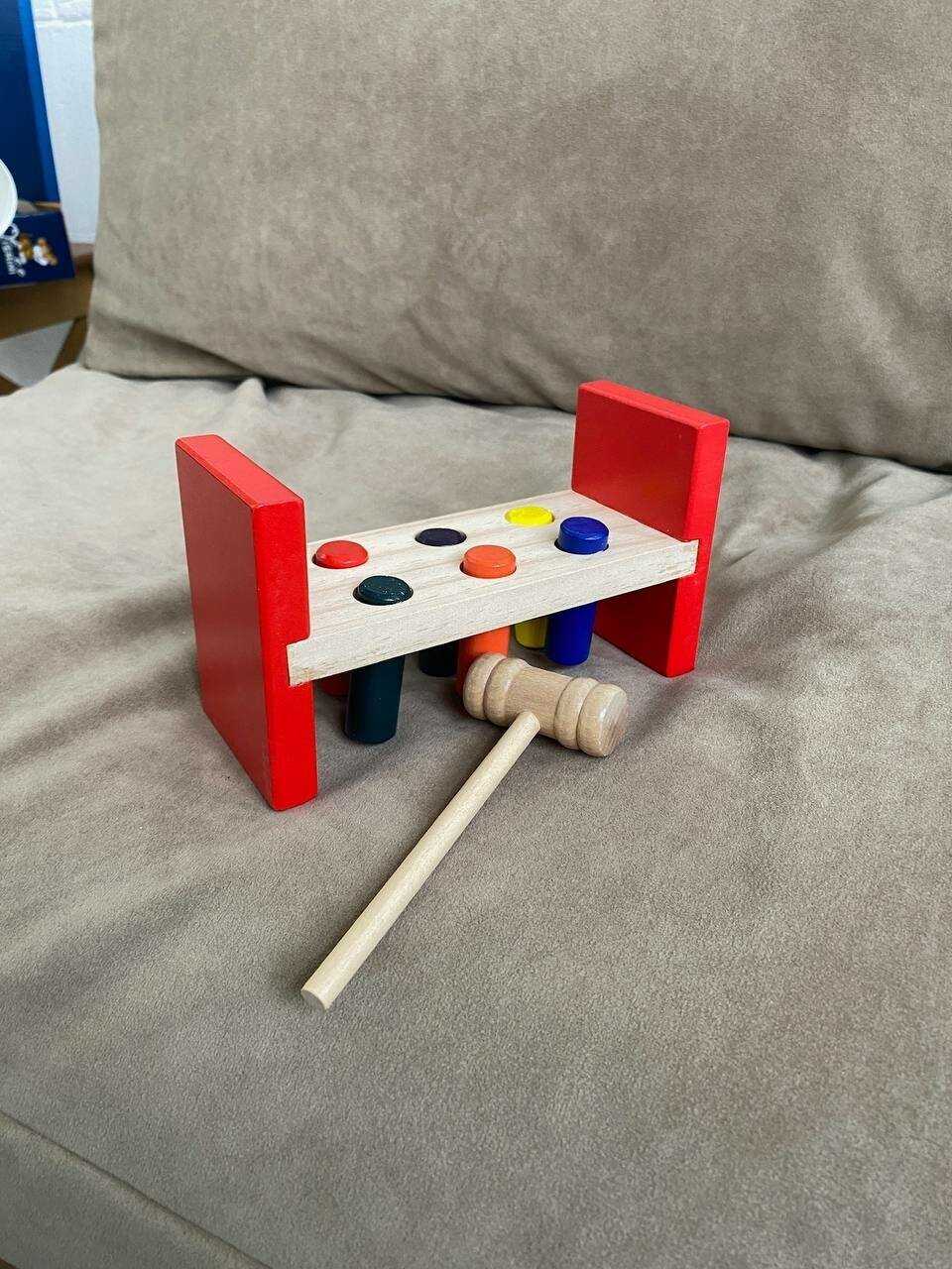 - + Очень занимательная игрушка для ребенка 1,5г. Сын пока не молотком, а пальчиком продавливает деревяшки. Или достает их и обратно засовывает. В общем, может занять минут на 15-20.
