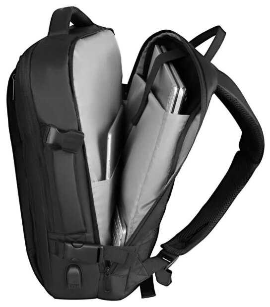 - + Стильный рюкзак из водоотталкивающего материала. Вполне достаточное количество отсеков. Особенно приятное и функциональное достоинство-встроенный USB-разъем для подключения внешнего аккумулятора, благодаря чему заряжать смартфон и прочие гаджеты становится весьма удобно-подключил USB-кабель устройства к разъему рюкзака и продолжаешь...