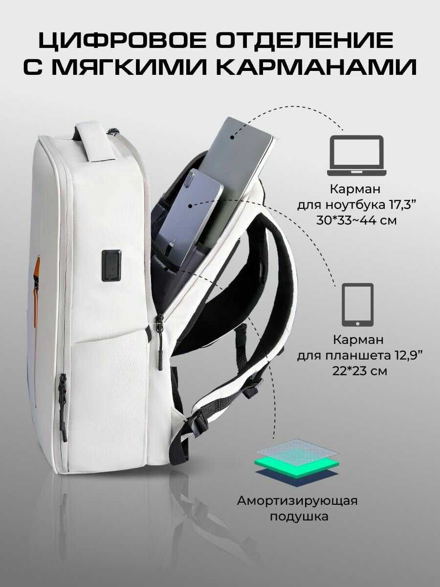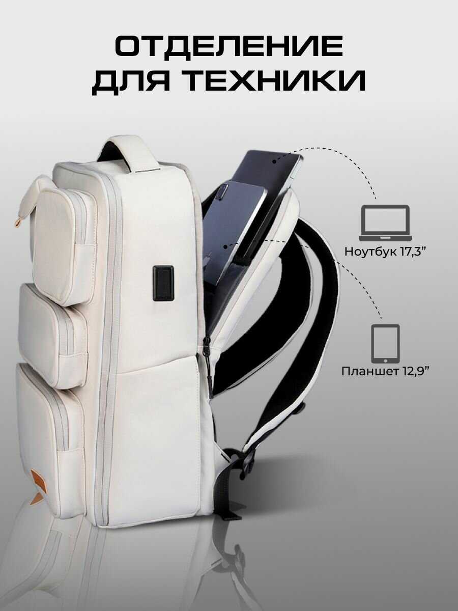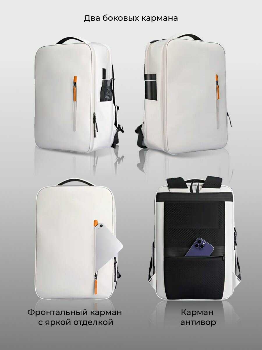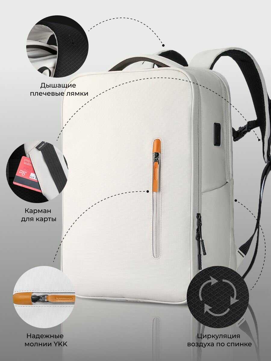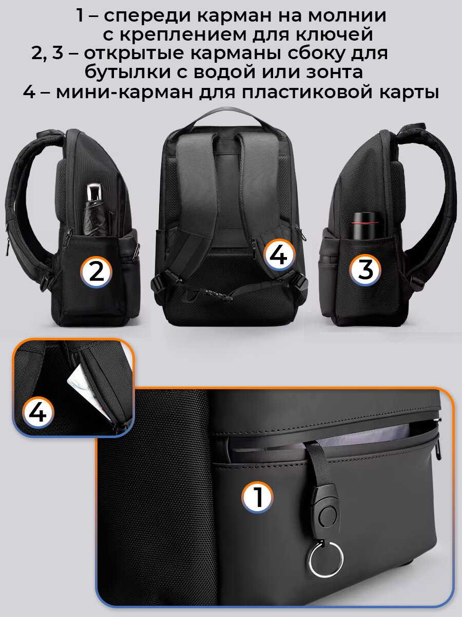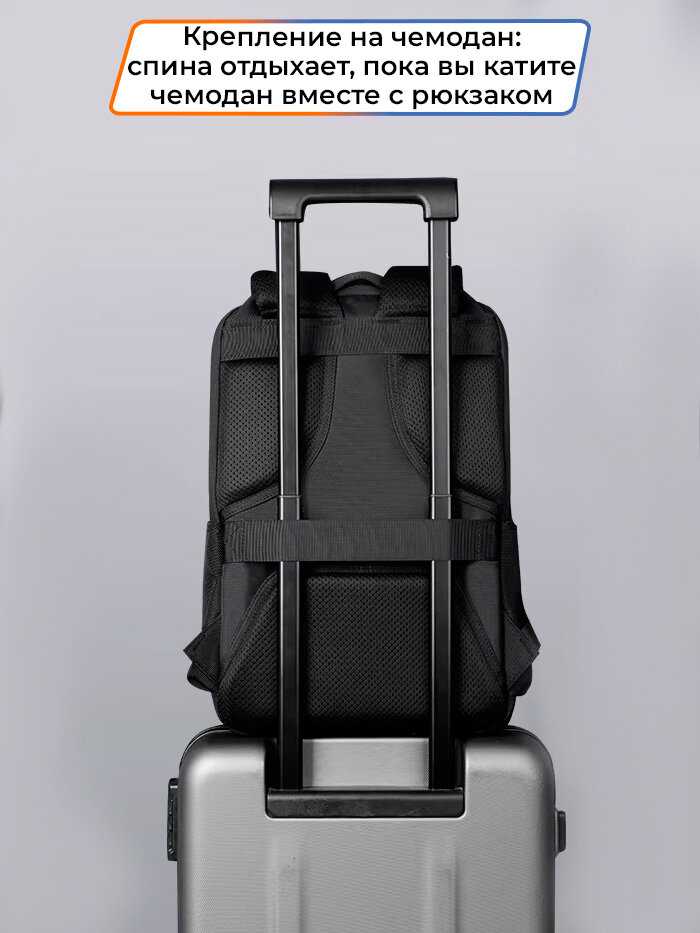 - + Вместительный, функциональный, много карманов, специальные отделения для ноутбука и планшета, есть отделение для вещей, как в багажных сумках и чемоданах, компактные габаритные размеры позволят взять его в ручную кладь на самолет (вроде бы, не сверял с правилами провоза багажа авиакомпаний), можно положить внутрь power bank и заряжать смартфон через внешние порты рюкзака и продолжать пользоваться телефоном.