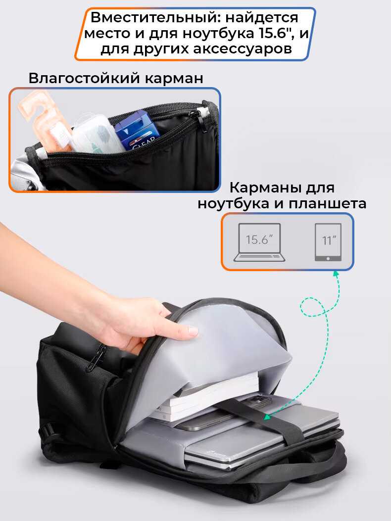 Отделение для ноутбука рассчитано на стандартные модели, обеспечивая надежную фиксацию благодаря плотной конструкции и резиновым держателям. Однако ноутбуки с диагональю 16 дюймов в защитном чехле уже не помещаются, что подтверждается отзывами пользователей. Прочность этого отсека особо отмечается как преимущество, предотвращающее повреждения техники. -