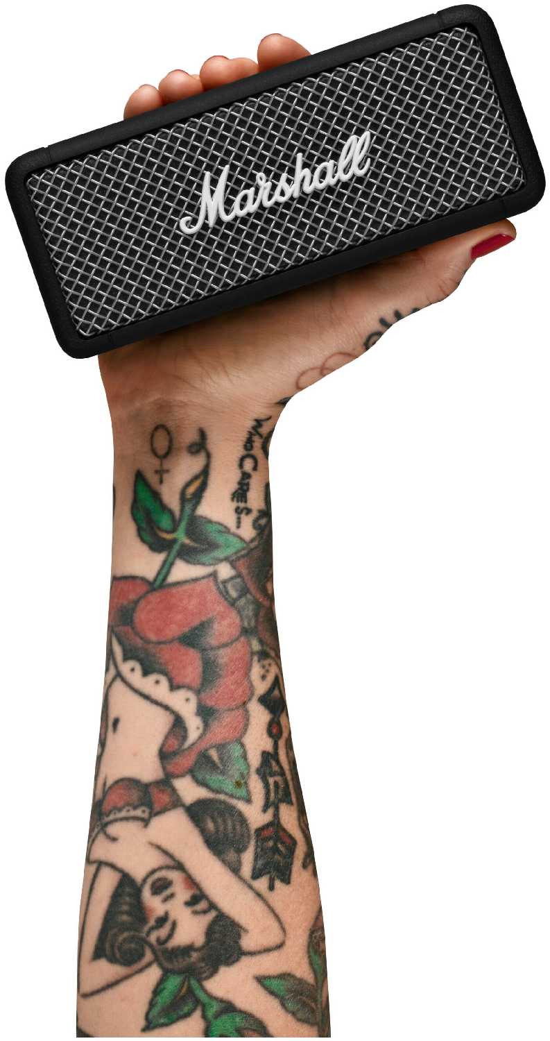 Marshall EMBERTON куда компактнее, фактически карманная Bluetooth-колонка, в сравнении с носимой за "гитарный" ремень портативной беспроводной акустикой этого же бренда - STOCKWELL II, но играет "малышка" EMBERTON значительно громче.