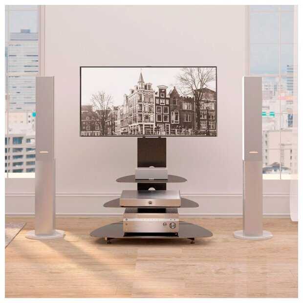 - + Подставка эргономична, она хорошо смотрится как в углу комнаты, так и посередине стены. Стеклянные полки выдерживают приличную нагрузку. Телевизор действительно крепко держится.