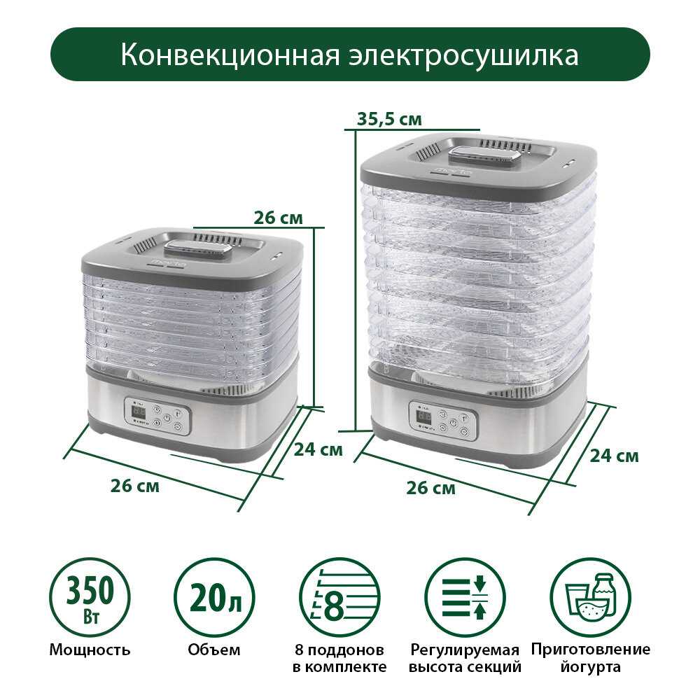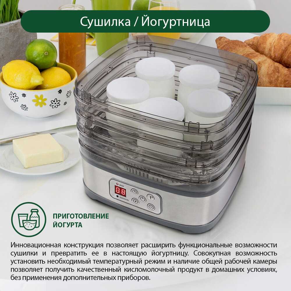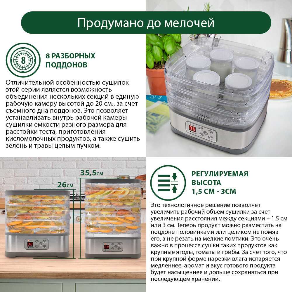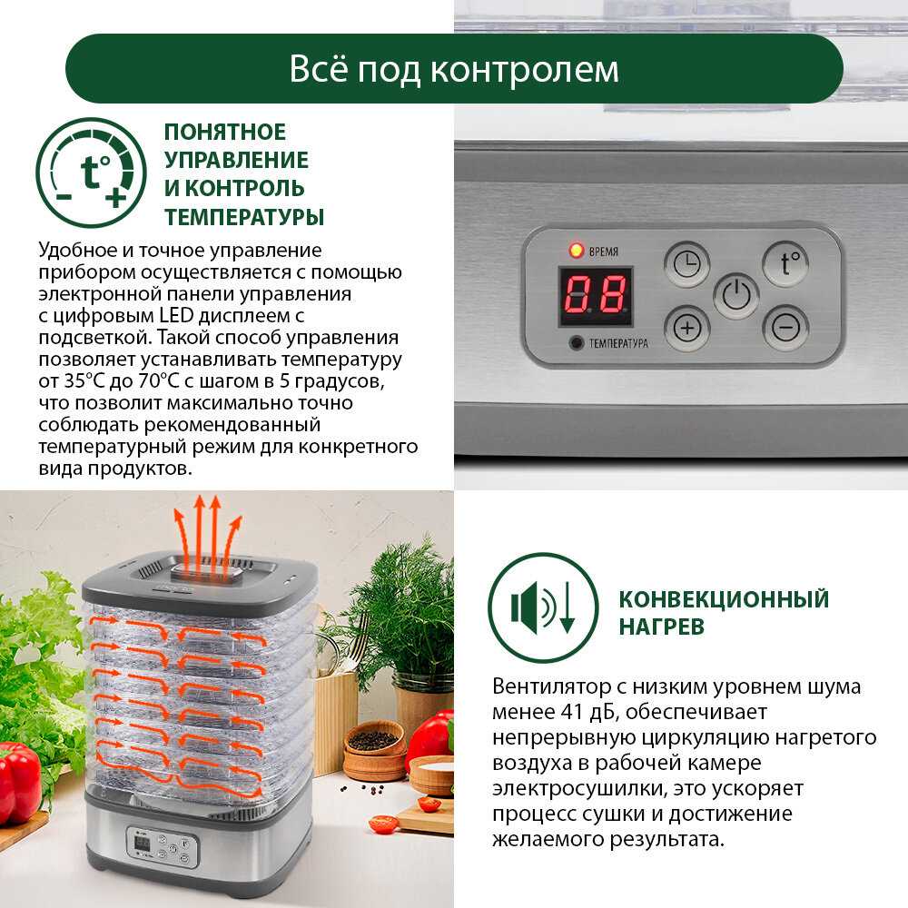 Чудесная сушилка с понятным и простым управлением. Хорошая цена за достаточно вместительный аппарат. Пользуюсь с удовольствием и если вы не планируете сушить различные ингредиенты в промышленных масштабах, уверен это именно то, что нужно!