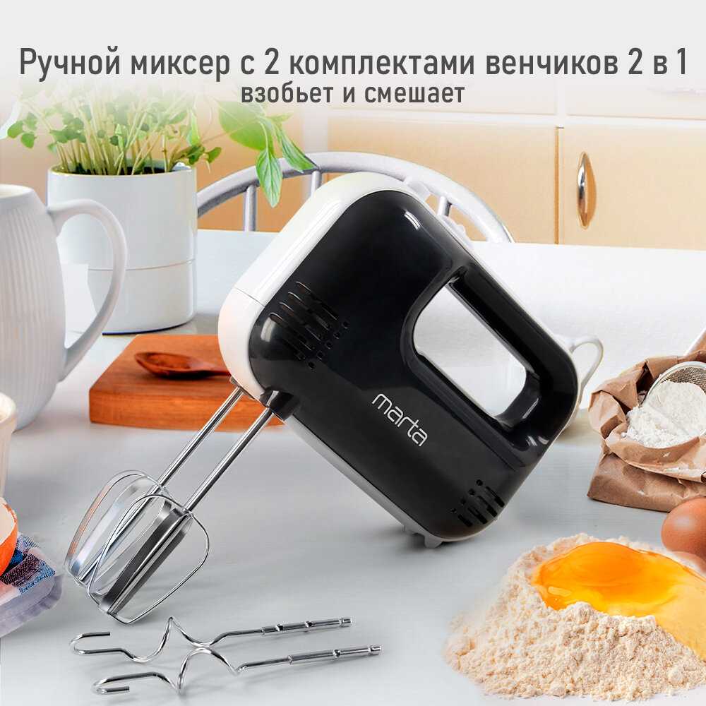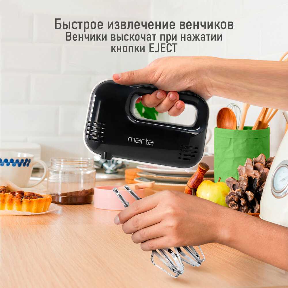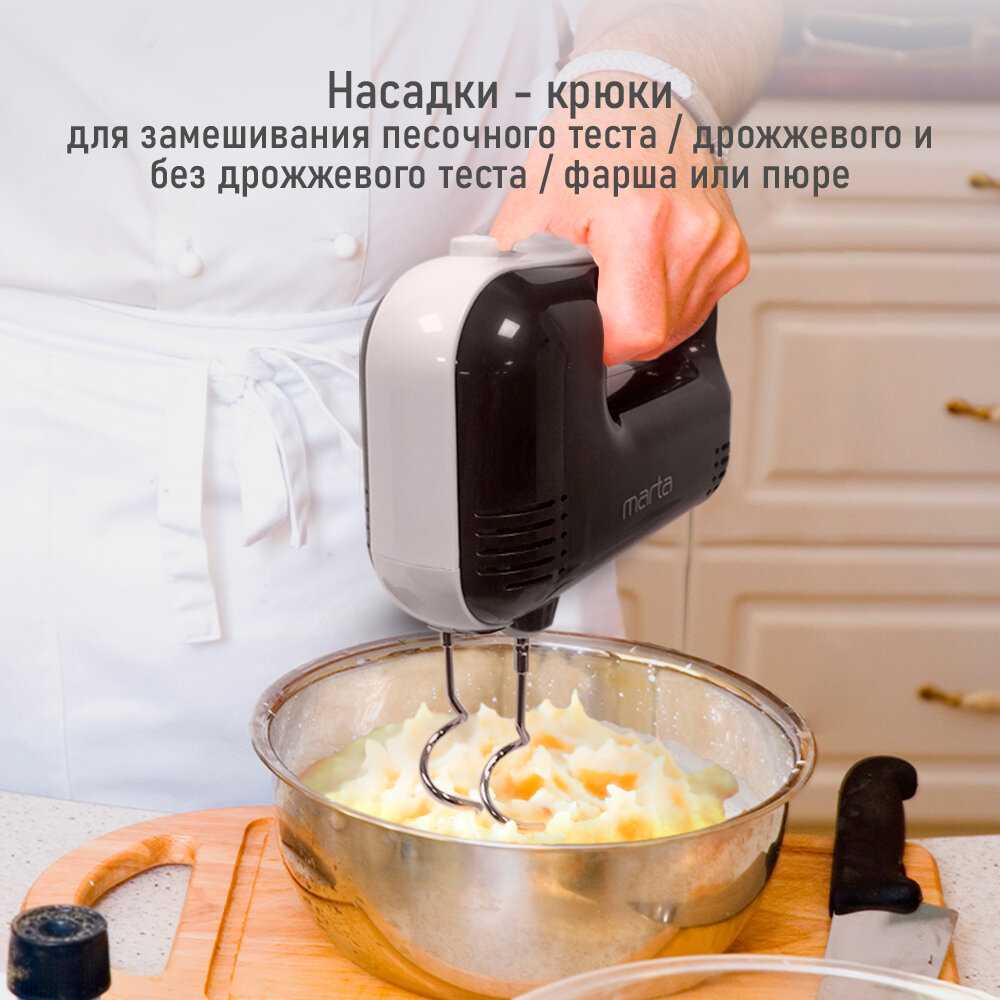 Эксплуатационные характеристики и производительность: Мощность и эффективность взбивания: Анализ отзывов подтверждает, что миксер Marta MT-MX1515B обладает достаточной мощностью для решения широкого круга кулинарных задач. Пользователи отмечают его эффективность при взбивании белков для безе до устойчивых пиков, приготовлении пышных кремов для тортов, замесе теста для блинов, кексов и даже более плотного теста. Наличие пяти скоростных режимов и турборежима позволяет гибко подбирать интенсивность обработки в зависимости от консистенции ингредиентов. Турборежим особенно ценится за возможность быстро довести смесь до нужной кондиции. Эмпирические данные указывают на то, что устройство справляется с задачами быстро, что отмечается в контексте приготовления сложных блюд, таких как торт, за ограниченное время. Однако некоторые пользователи отмечают, что для профессионального кондитерского использования или очень плотного теста мощность может быть недостаточной, указывая на его ориентацию на бытовые нужды. Работа с разными типами продуктов и насадками: В комплектации устройства пользователи выделяют наличие двух типов насадок: венчиков для взбивания и крюков для замеса теста. Насадки, по словам пользователей, выполнены из нержавеющей стали, не гнутся в процессе эксплуатации и легко моются. Миксер демонстрирует хорошие результаты при работе с жидкостями и полужидкими массами – яйцами, кремами, соусами, тестом для блинов. Отдельно отмечается его эффективность для специфических задач, таких как смешивание красок для волос, что говорит о его универсальности. Критические замечания касаются длины венчиков, которые некоторые пользователи считают коротковатыми для оптимального взбивания в объемной чаше, а также того, что чаша может вращаться не всегда равномерно, иногда требуя ручного вмешательства для лучшего смешивания ингредиентов по краям. Тепловой режим и уровень шума: Важным аспектом надежности, отмеченным в отзывах, является стабильный тепловой режим устройства. Пользователи, эксплуатирующие миксер в течение длительного времени (приготовление коржей для торта, замес теста), указывают на отсутствие перегрева двигателя. Уровень шума характеризуется большинством как приемлемый для домашнего использования, некоторые даже отмечают, что устройство работает "почти бесшумно" или "тихо", что позволяет использовать его, не беспокоя домочадцев. Вместе с тем, встречаются отдельные мнения о повышенной вибрации или шуме, превышающем ожидания, что может быть связано с особенностями сборки конкретных экземпляров или характером работы на высоких оборотах.