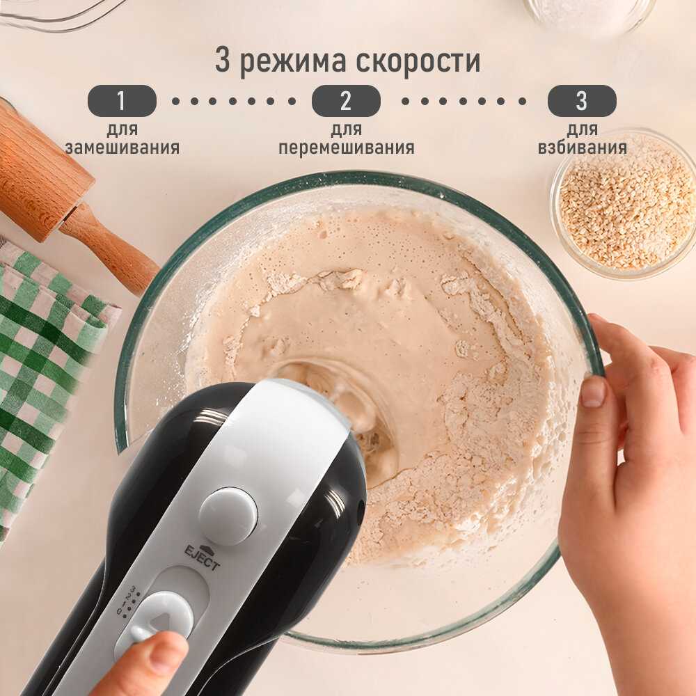 - Переключение режимов без остановки поддерживает равномерность смеси, улучшая текстуру теста для блинов или кексов.