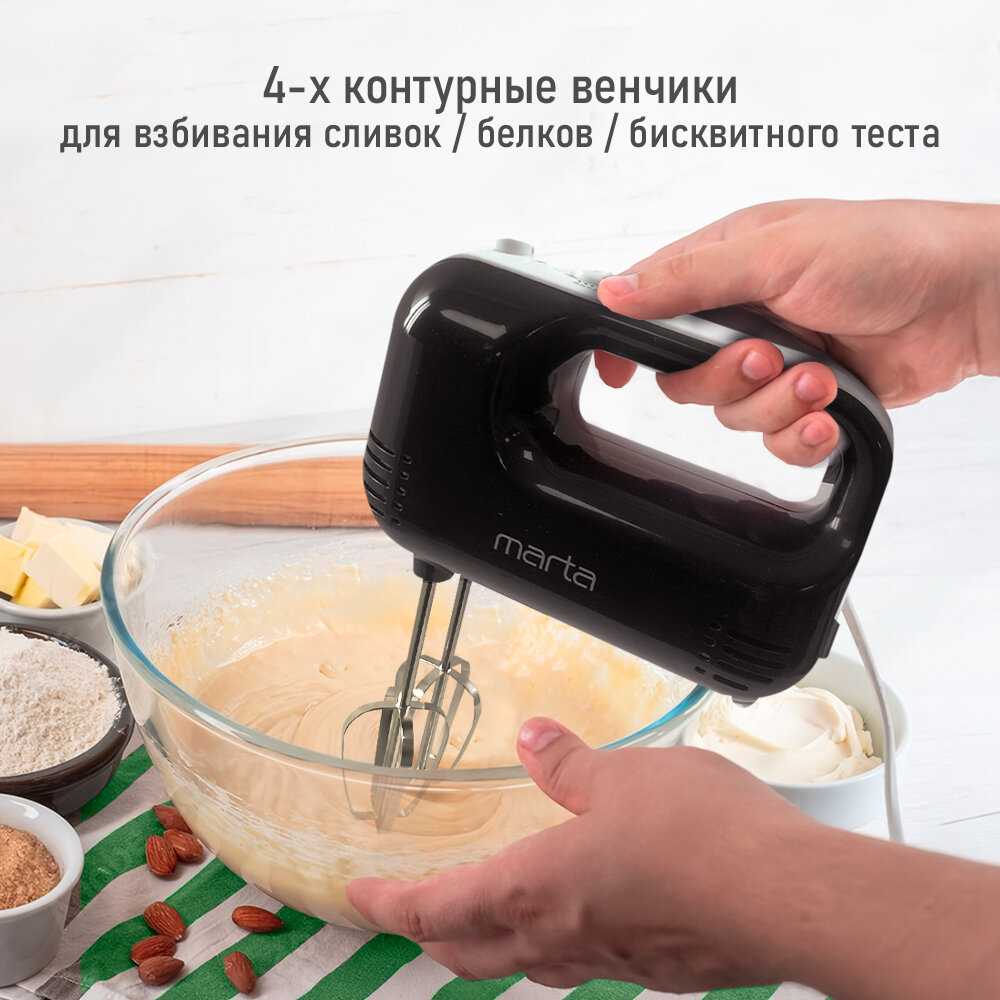 Мощность и эффективность взбивания: Анализ отзывов подтверждает, что миксер Marta MT-MX1515B обладает достаточной мощностью для решения широкого круга кулинарных задач. Пользователи отмечают его эффективность при взбивании белков для безе до устойчивых пиков, приготовлении пышных кремов для тортов, замесе теста для блинов, кексов и даже более плотного теста. Наличие пяти скоростных режимов и турборежима позволяет гибко подбирать интенсивность обработки в зависимости от консистенции ингредиентов. Турборежим особенно ценится за возможность быстро довести смесь до нужной кондиции. Эмпирические данные указывают на то, что устройство справляется с задачами быстро, что отмечается в контексте приготовления сложных блюд, таких как торт, за ограниченное время. Однако некоторые пользователи отмечают, что для профессионального кондитерского использования или очень плотного теста мощность может быть недостаточной, указывая на его ориентацию на бытовые нужды.