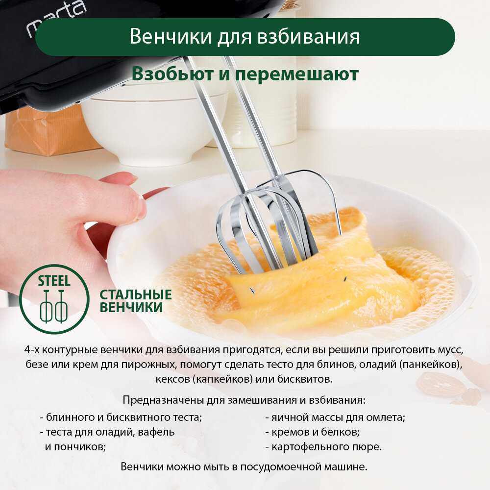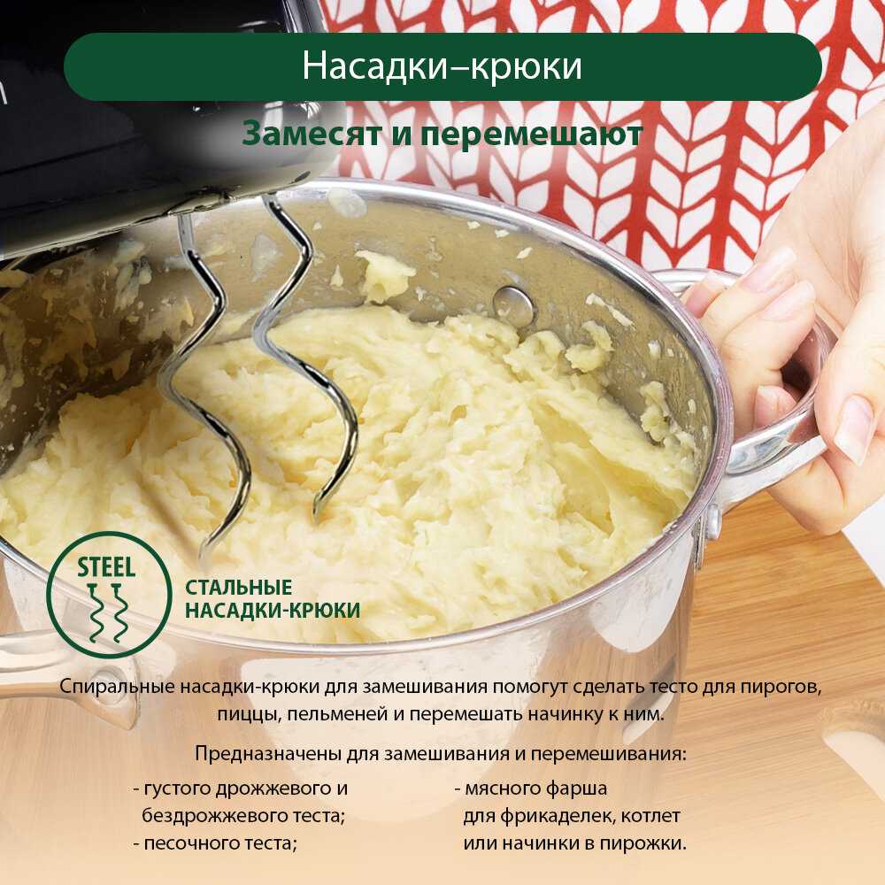 - В комплект входят венчики для взбивания и крюки для замешивания теста, покрывающие основные кулинарные задачи пользователей.
