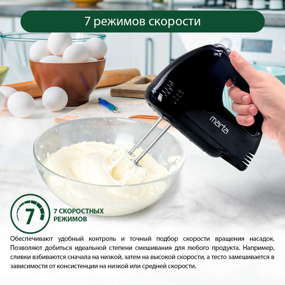 - Множество скоростей (до 7 режимов) обеспечивает гибкость в работе с различными консистенциями, от жидких кремов до густого теста.