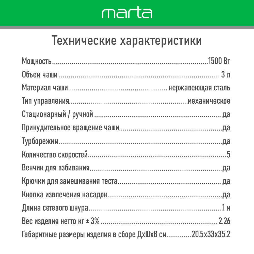 Характеристи Marta Миксер с чашей (MT-MX1522A)