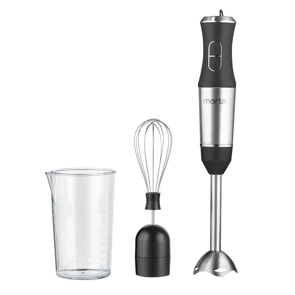 C техникой "Marta" знакомы.Недавно покупали йогуртницу. Пришло время обновить блендер, так как старый сломался от нехватки мощности. Первое на что обратили внимание это комплектация, заменяет практически всю технику на кухне. Второе это мощность прибора 1000 Вт. Очень хорош погружной блендер, перебивает супы, соусы, ягоду. У кого есть маленькие дети не заменимая вещь. Есть тёрки с разными насадками.Делали корейскую морковь. Легко мелит сырой картофель для драников. Погружная часть сделана из металла.