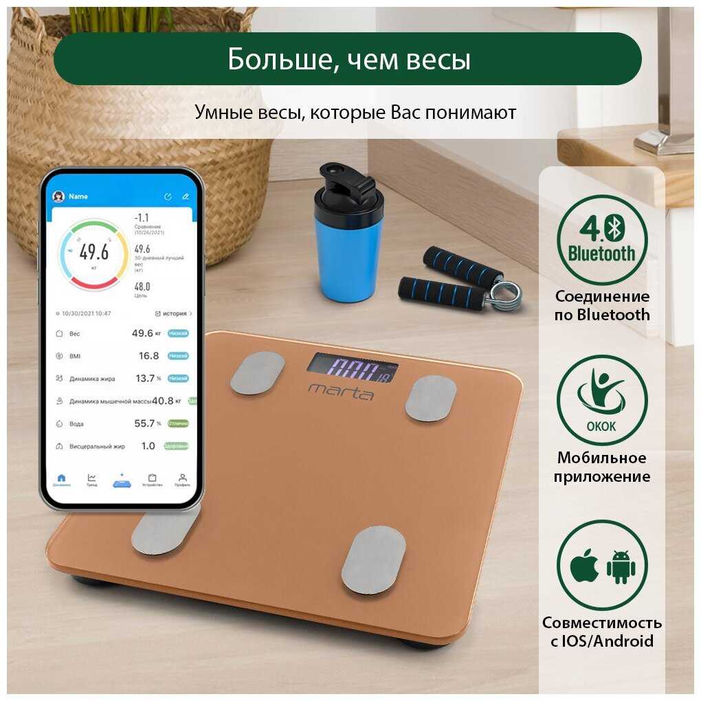 Весы напольные MARTA MT-1607 золотистый опал, пришли целые, хорошо упакованы. Приложение скачала, быстро подключились, на счет точности сказать не могу - сравнить не с чем.