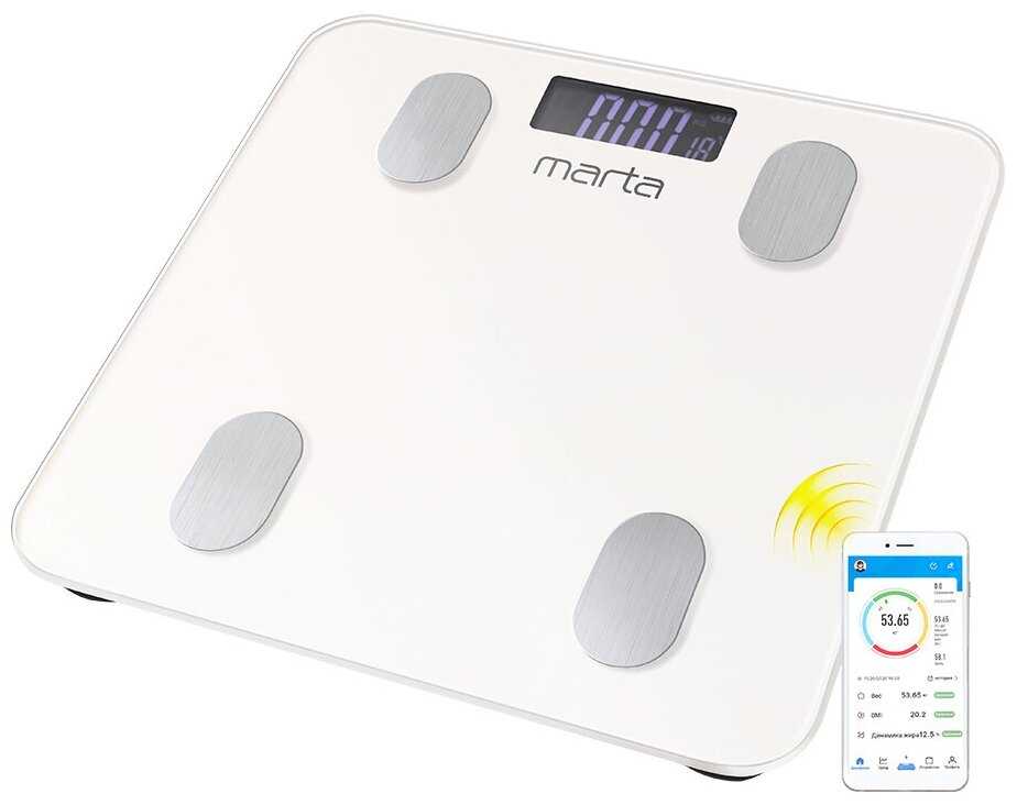 Купил весы MARTA MT-1683. Прям вау! Белый жемчуг - такие стильные. LCD экран - четко все показывает. С Bluetooth - удобно. Все как надо! Легко пользоваться, результаты точные. Передают на телефон - класс! Рекомендую, берите не пожалеете!