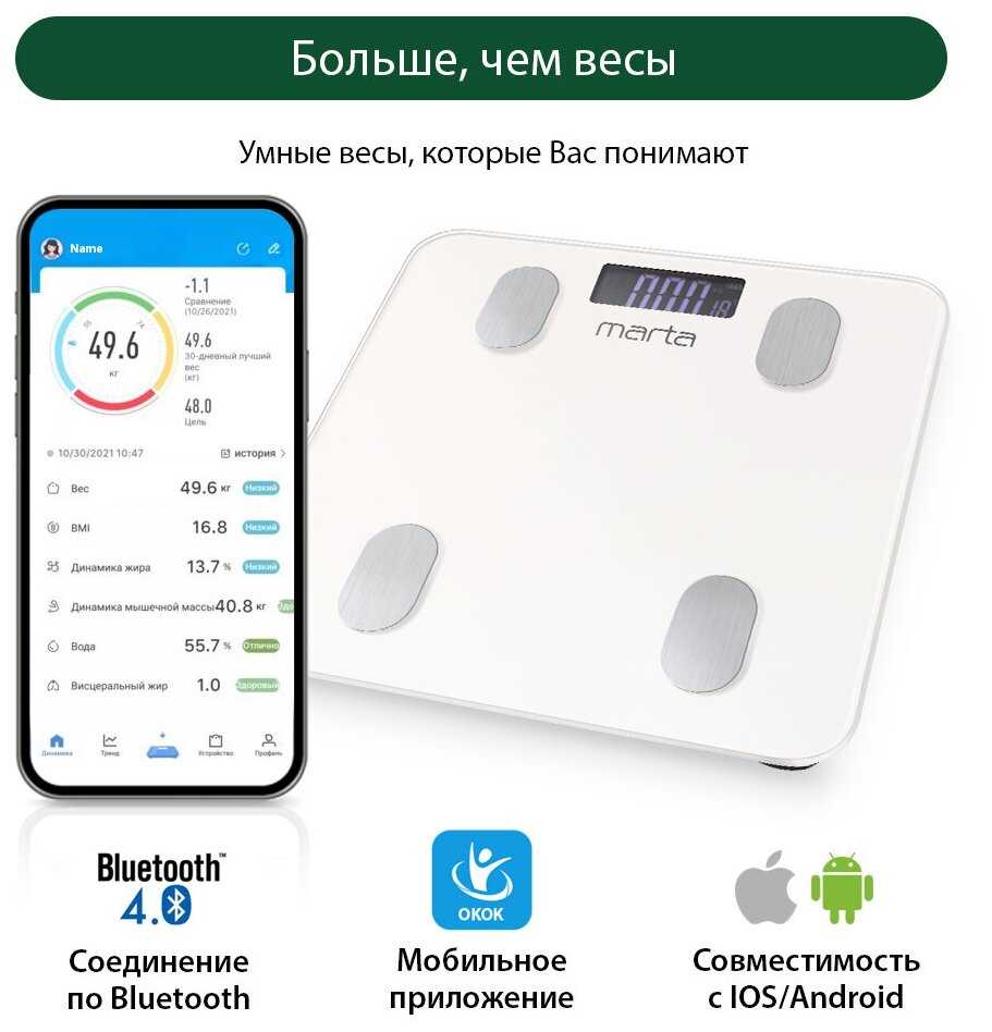 Отличные весы! Купил MARTA MT-1683 и в восторге. Белый жемчуг выглядит стильно. LCD экран понятен, даже моей бабушке! Диагностика точная, результаты быстро на Bluetooth. Подружились с телефоном легко. Удобные и функциональные весы за свою цену. Рекомендую!