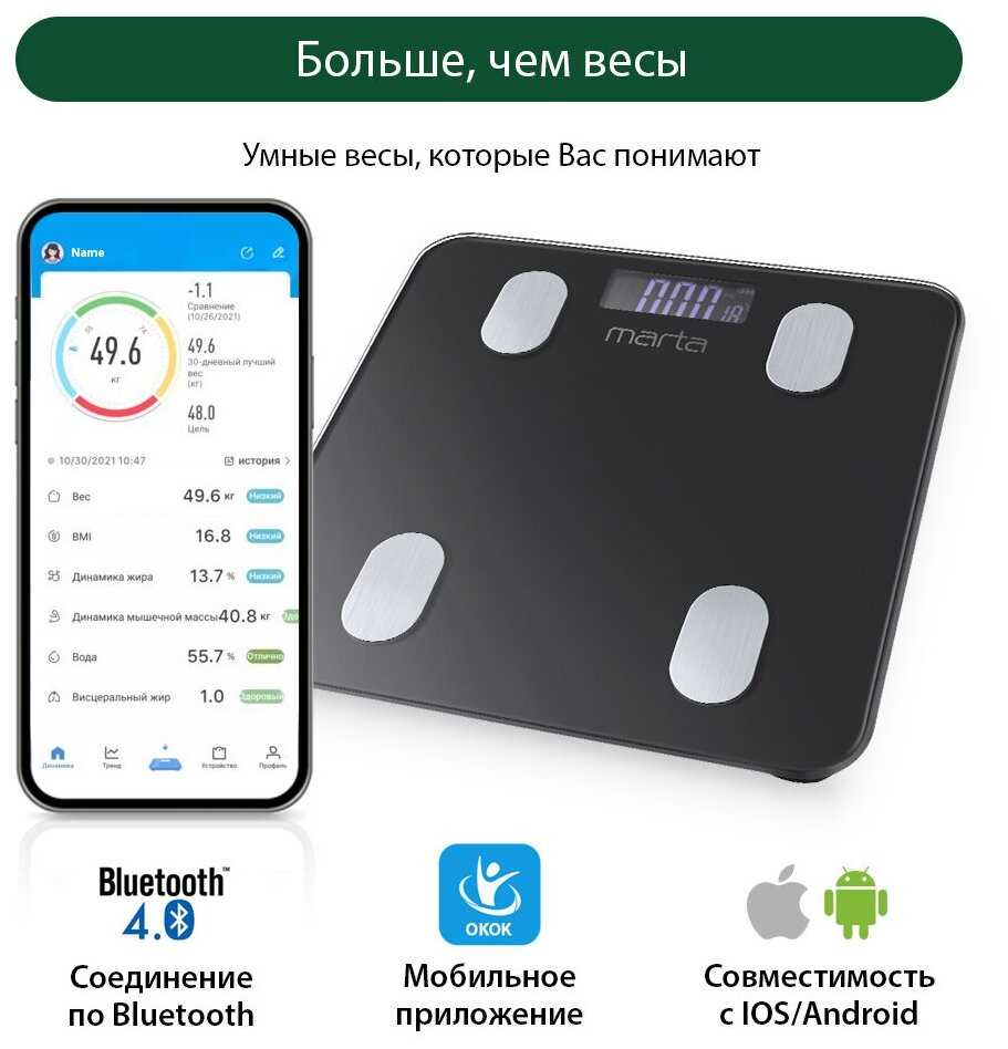 - + Качественный материал, ударопрочное стекло, приложение для отслеживания динамики изменения веса и других весовых характеристик, точные измерения.