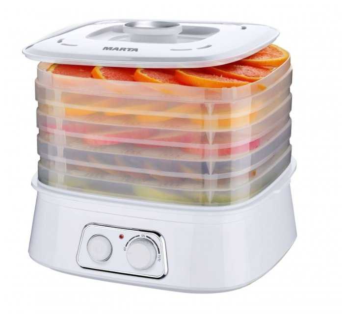 - 5 съёмных поддонов с регулируемой высотой (до 8.5 см) позволяют сушить крупные куски или мелкие ягоды.